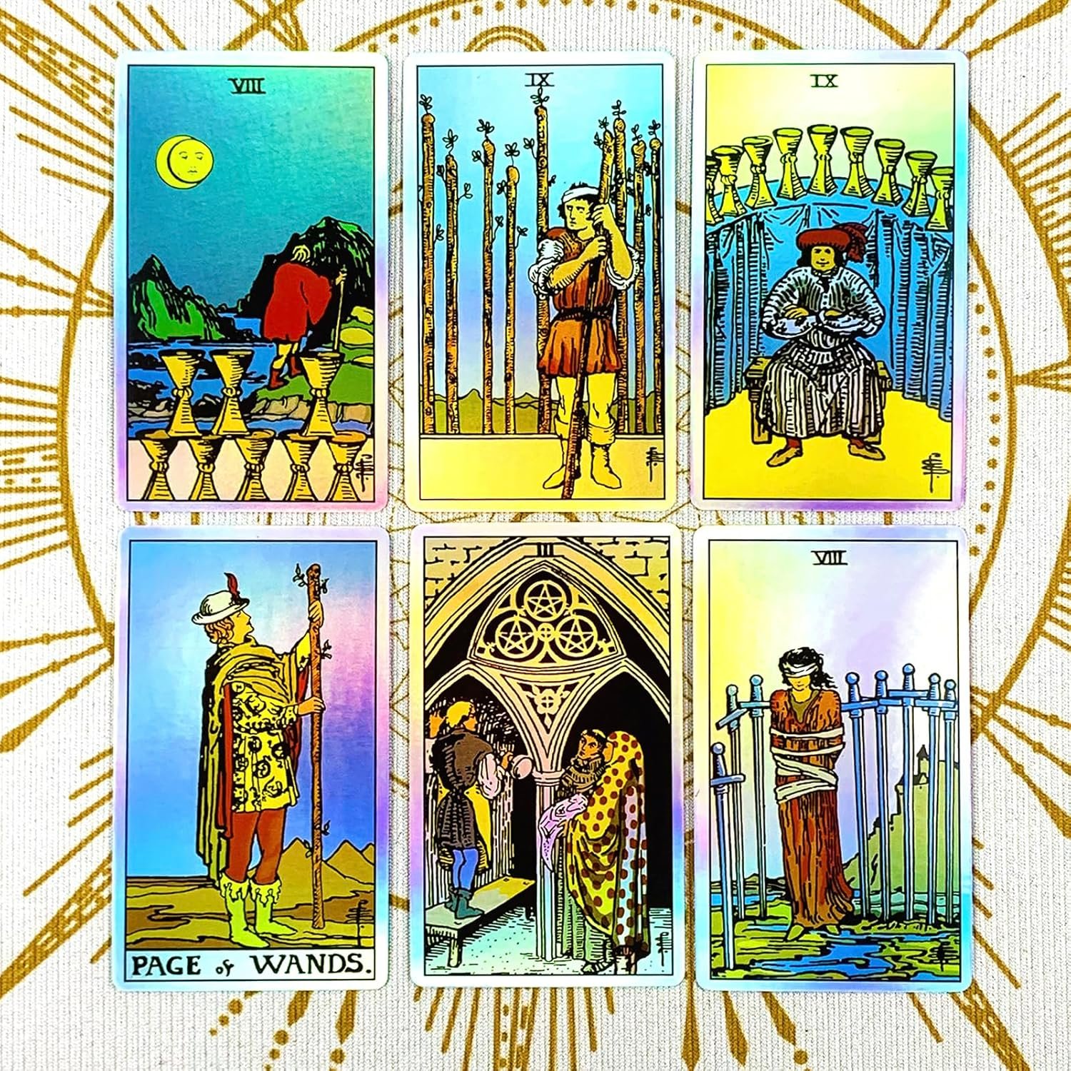 Tarot cards with the traditional Pamela Colman Smith artwork are my favorite! I own many RWS decks with various color schemes, art styles, and special features. This deck has an iridescent silvery finish that’s shiny. The “rainbow” effect isn’t that strong, but they are pretty. The size (clearly noted in the description) is smaller than standard tarot cards, but not as small as a pocket or mini deck. They’re actually a nice in-between size that would make them lightweight and handy to carry with you, so that’s a positive.
