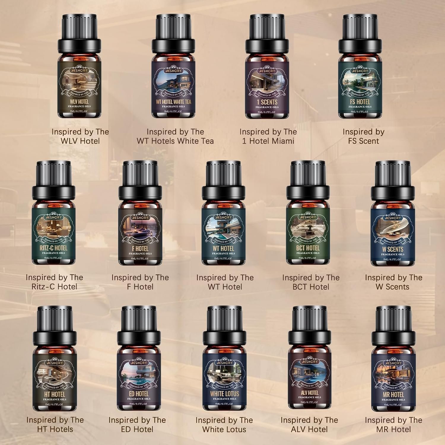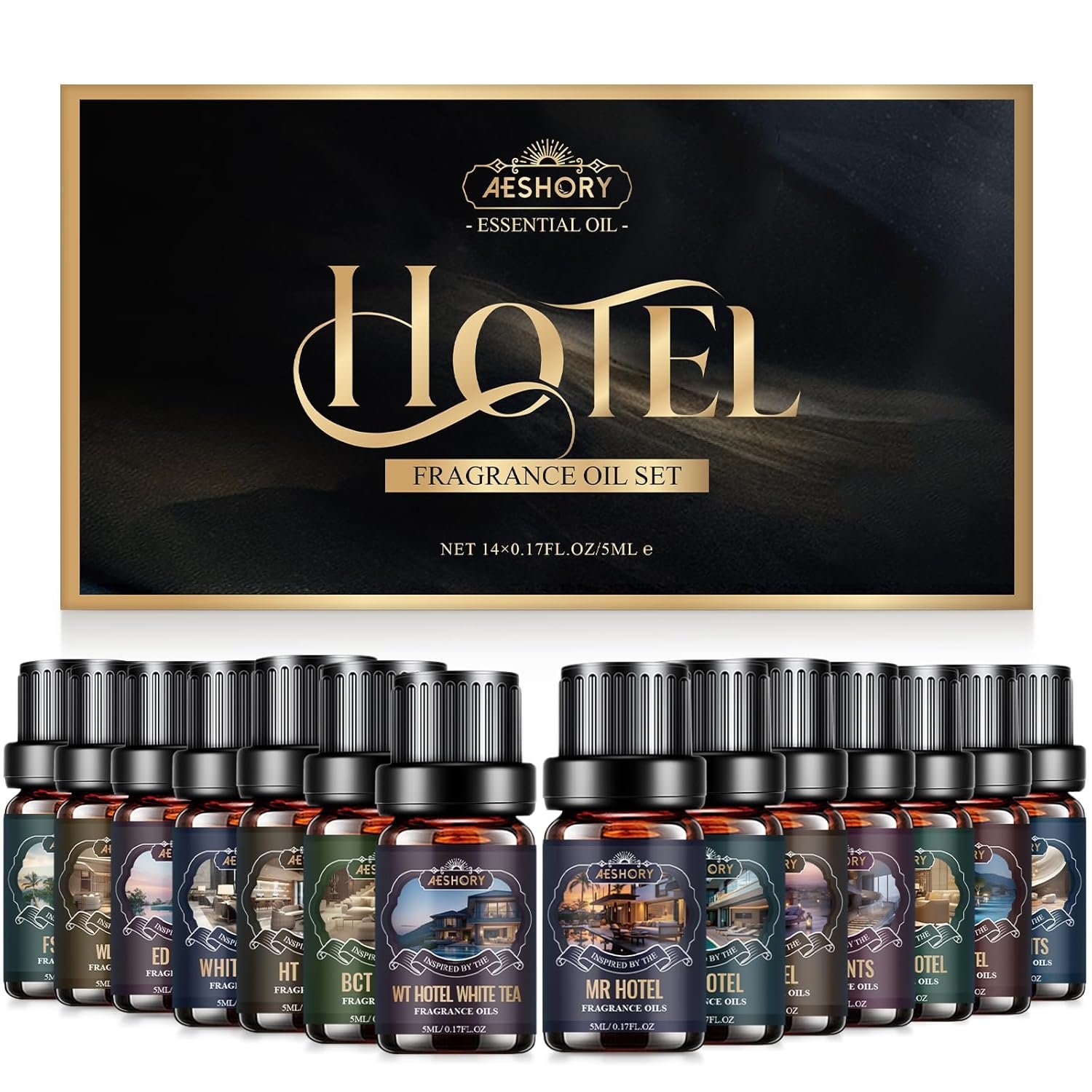- Hotel Collection Diffuser Oil: The AESHORY hotel collection diffuser oil set includes 14 fresh and luxury essential oil blends, each fragrance oil inspired by the signature aroma of world-famous hotels. These hotel diffuser oils let you bring the luxury of top hotels into your home, office, or any space effortlessly.