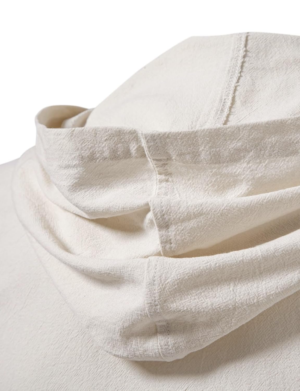 The material simulates a textured unfinished linen. The drawstrings are uncapped with a well used look. Note they will fray so use a fray check on the ends. I used this for my D&D Ranger cosplay at the session table so authenticity wasn’t much an issue for me. The material is thin and it does not stand up well to sweat … wear a similar color T-shirt underneath. For my game play, it works well. For Ren Faire enthusiasts … You may want a better quality shirt that can stand up to sweat. Sizes run small … An XL is really just L.