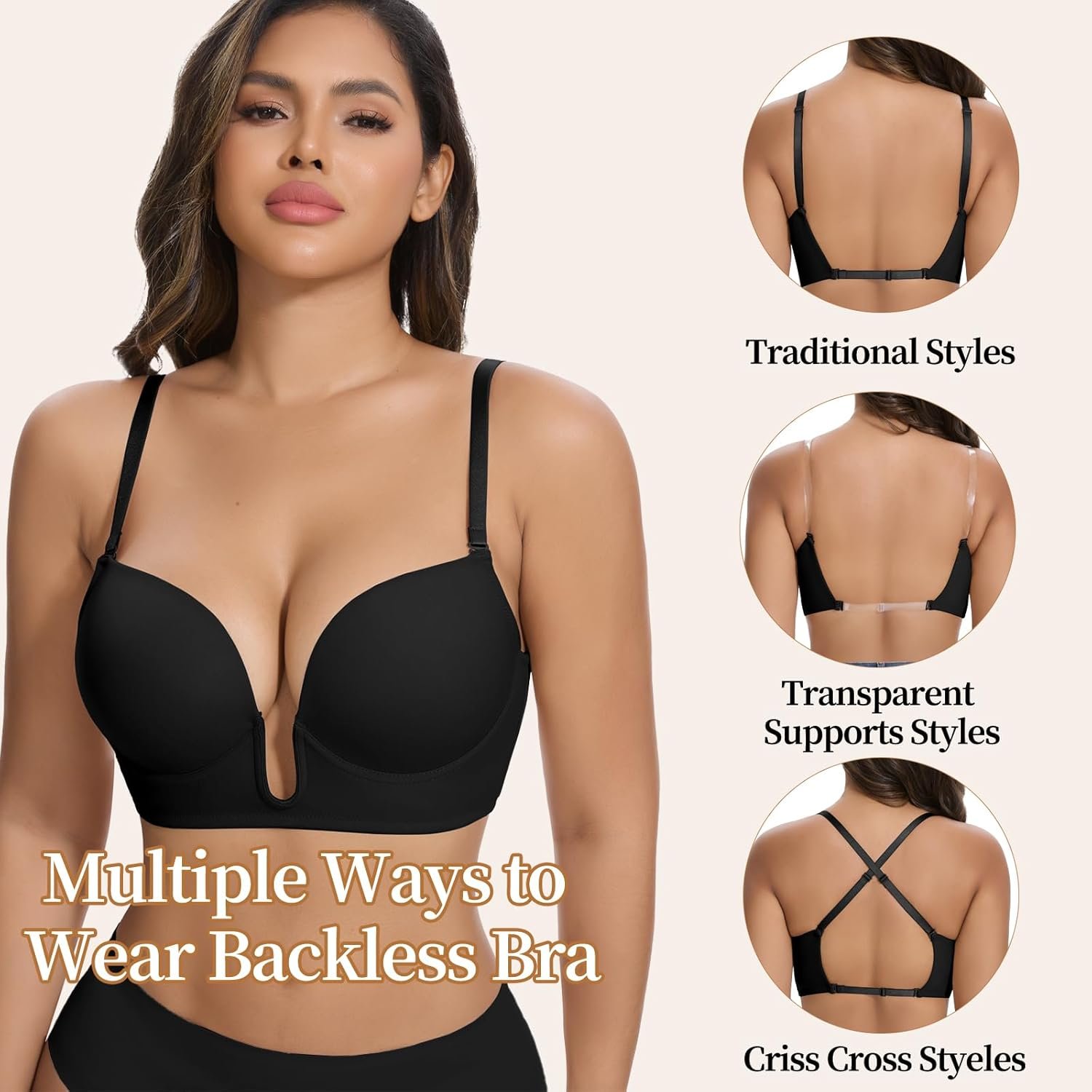 - Deep U Plunge Bra : Low back bra provide lift and make a v shape which makes the most of your fabulous cleavage. The angled cups and lower centre mean that deep plunge bras disappear under lower cut outfits and plunging dresses and v-neck tops. It allows you to feel confident and stylish without compromising on support.