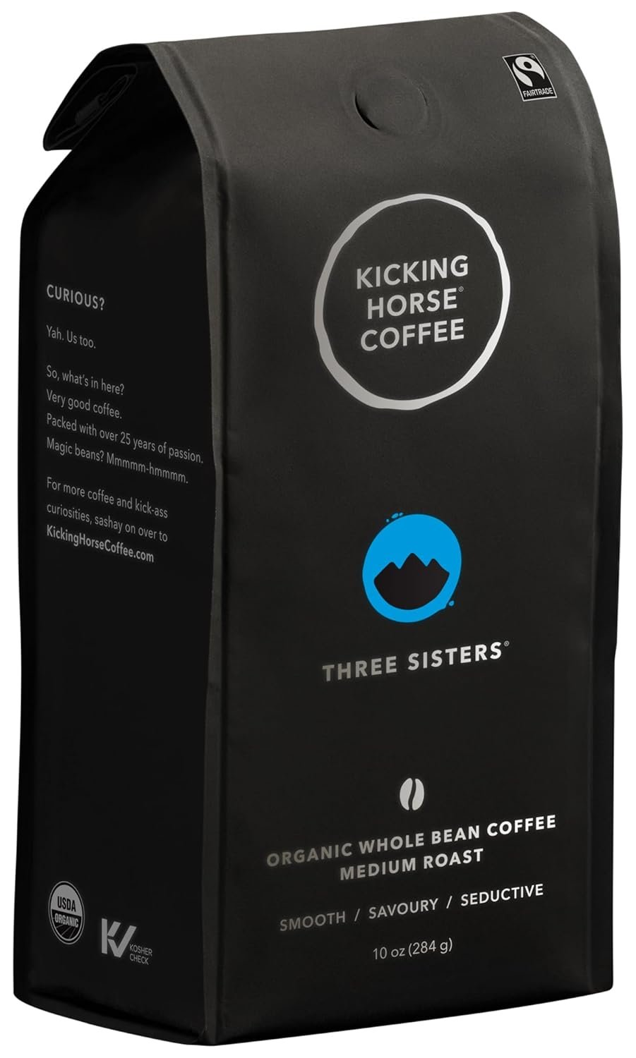Kicking Horse is fine coffee. I loved this Three Sisters blend so much when I first got some, so I bought it again. Over time however it began to not seem as tasty anymore. I was just getting over the novelty and tired of it I think. Not that it changed or anything but I moved on to Kicking Horse Lucky Jim. Now that is some real fine Joe. (Laughter permissable.)