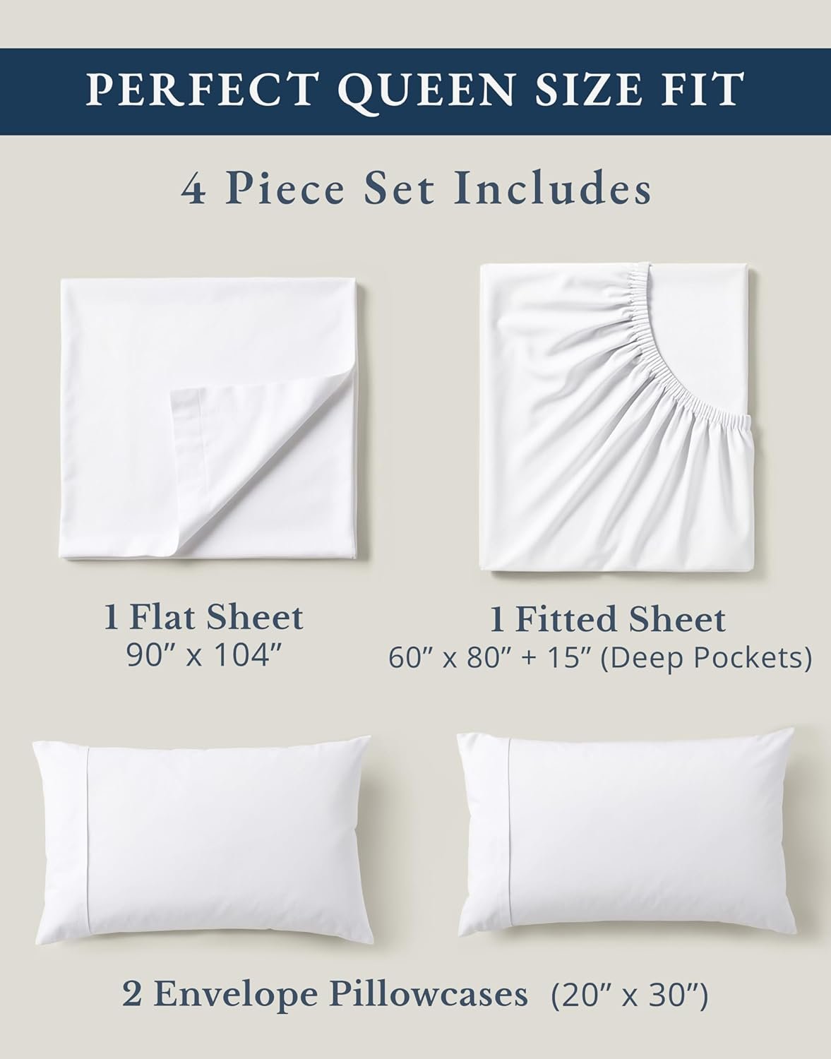 - Luxurious 4-piece bedding : Embrace luxury with our meticulously crafted 4-piece white queen sheets set. Our white sheets queen set includes 1 Flat sheet (90″ W x 104″ L)that offers ample coverage, 1 snug bottom Fitted sheet (60″ W x 80″ L) designed specifically for a queen mattress having 8″- 15″ deep pocket with all-around elastic and 2 Standard Queen Size Pillowcases (20″ W x 30″ L).