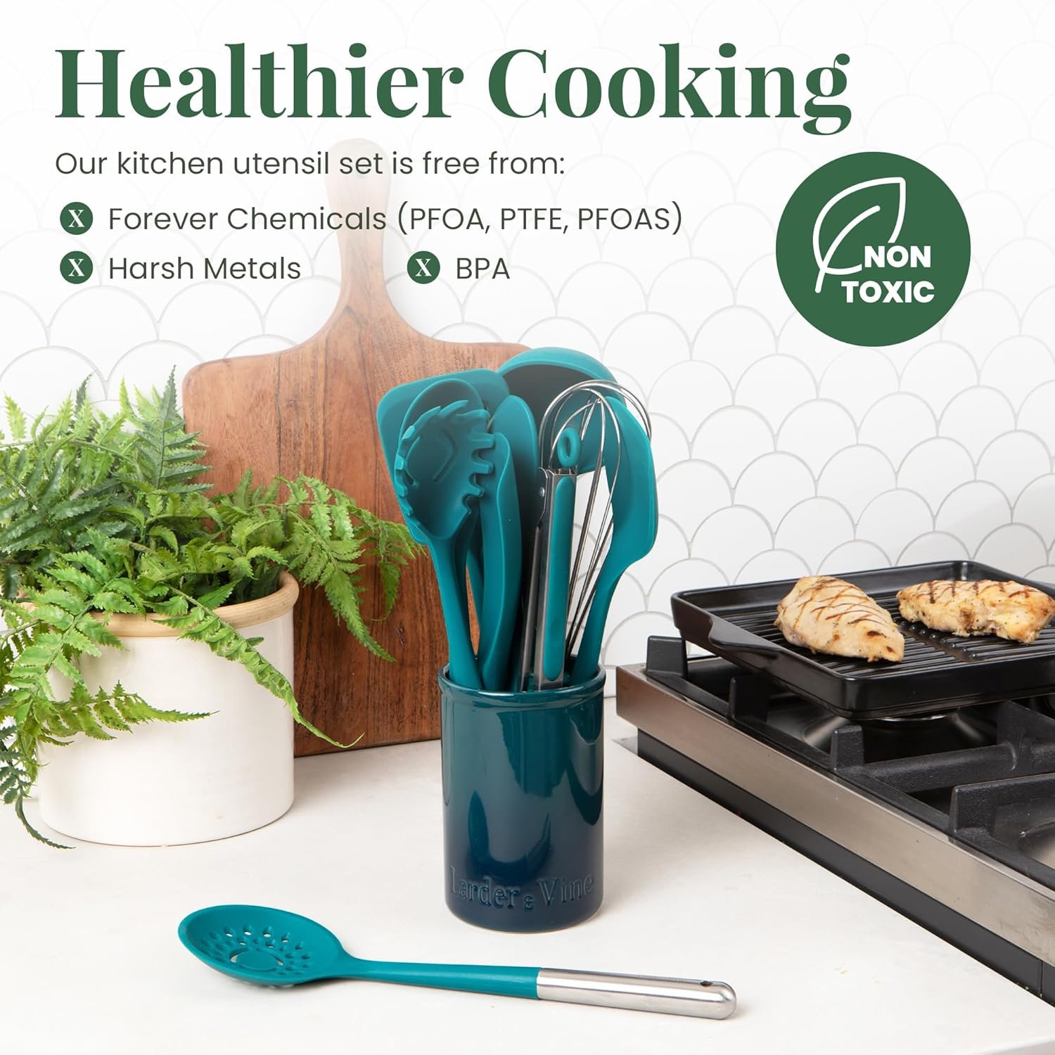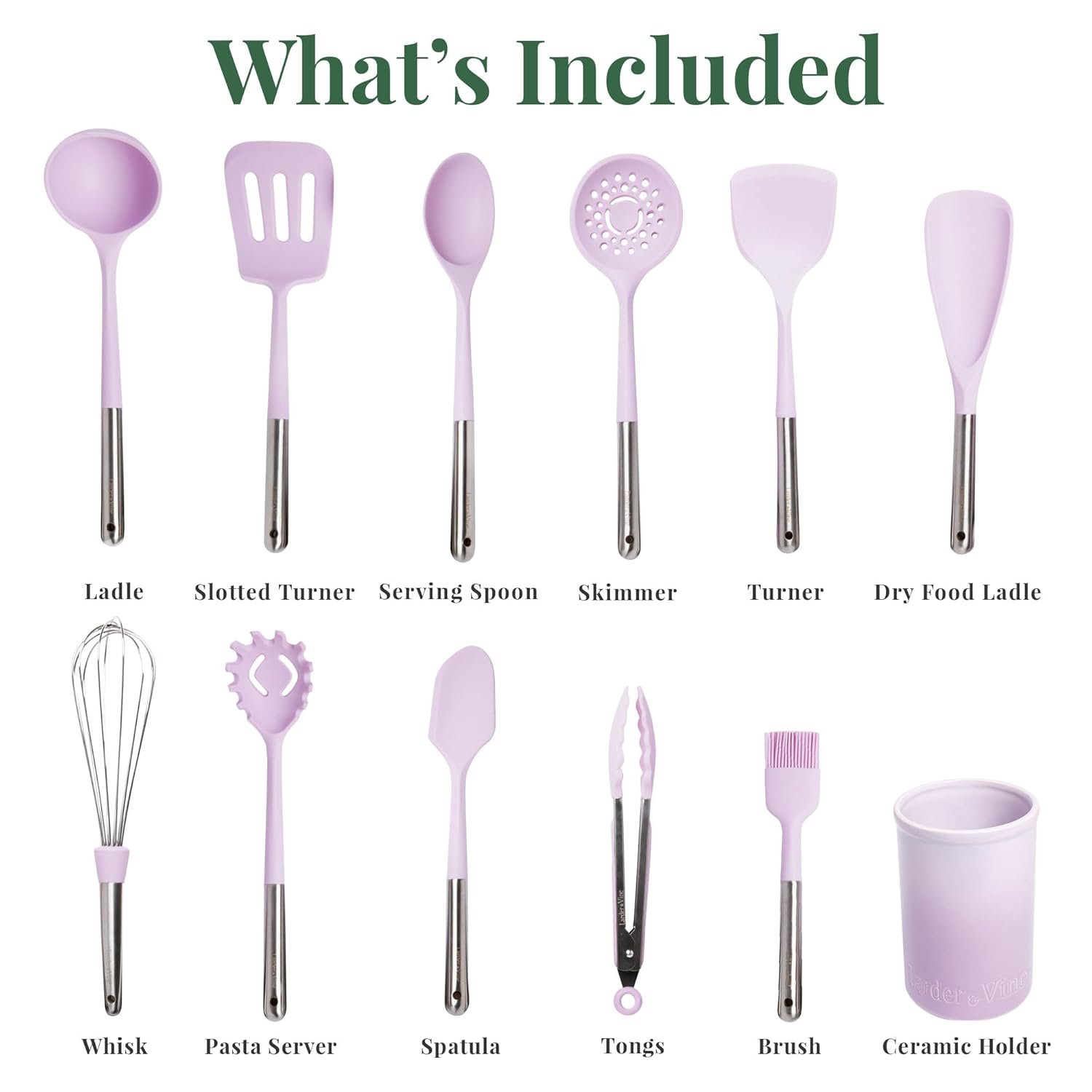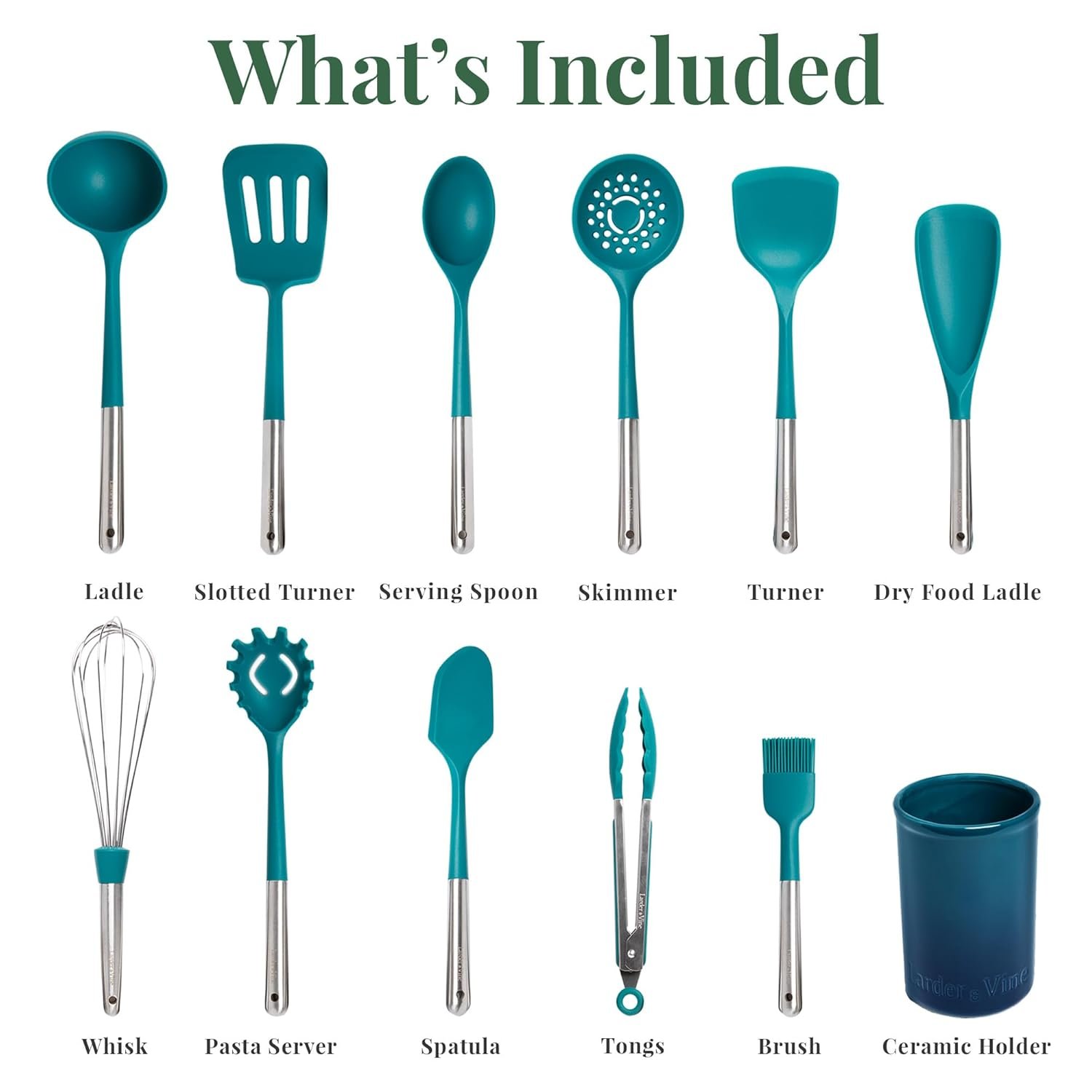 15 reviews for Larder & Vine 12-Piece Silicone Kitchen Cooking Utensils Set with Stainless Steel Handle and Ceramic Holder, Dishwasher Safe Set of Kitchen Essentials (Bondi)