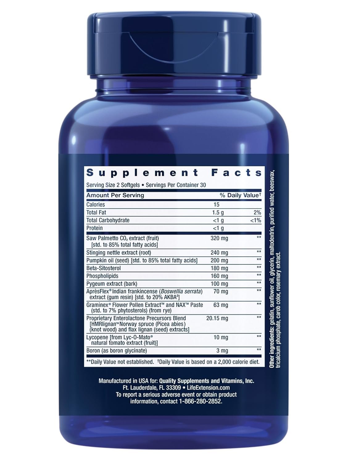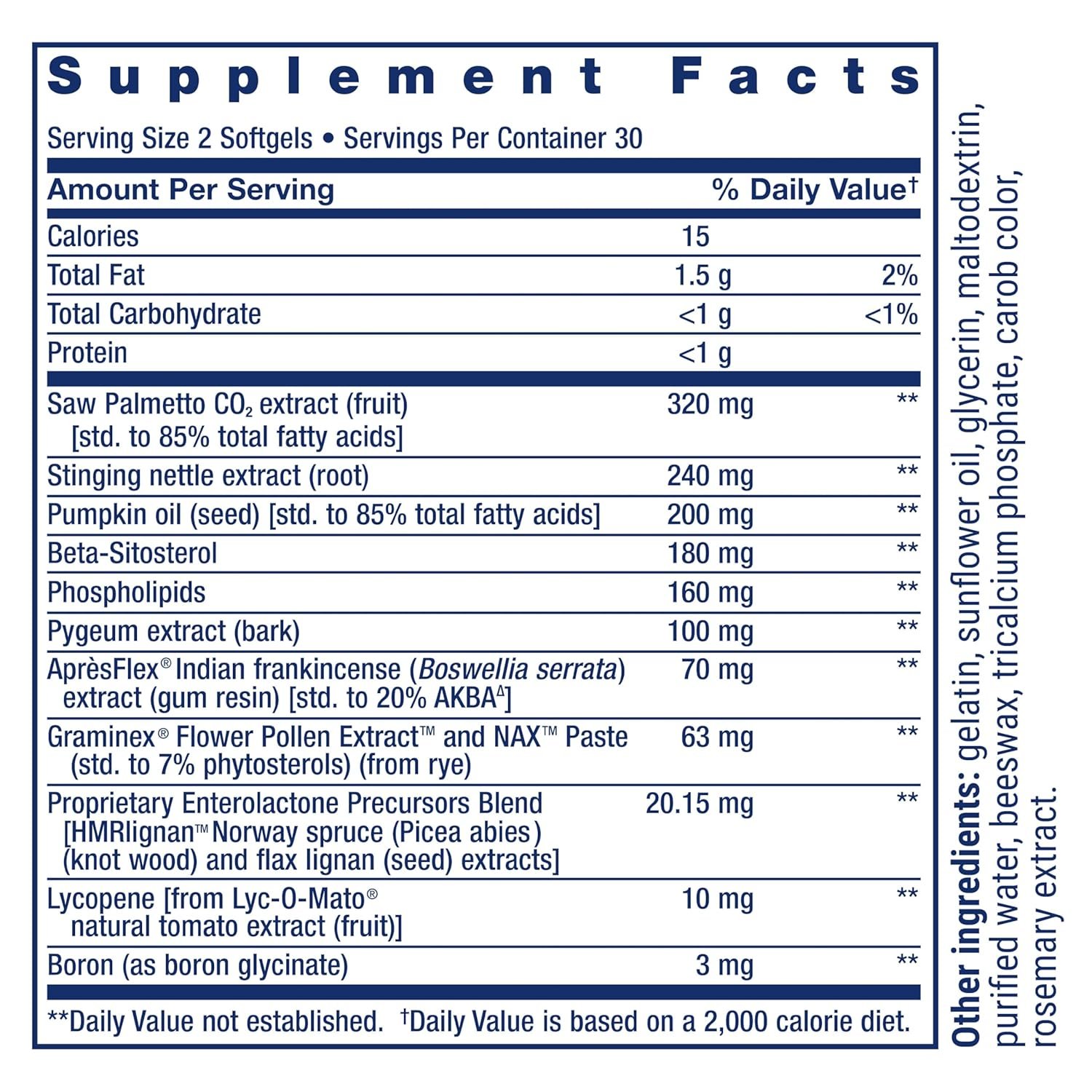 | Special Ingredients | AprèsFlex® Indian frankincense (Boswellia serrata) extract (gum resin), Beta-Sitosterol, Boron, Graminex® Flower Pollen Extract™ and NAX™ Paste (std. to 7% phytosterols) (from rye), Lycopene, Phospholipids, Proprietary Enterolactone Precursors Blend, Pumpkin oil (seed) [std. to 85% total fatty acids], Pygeum extract (bark), Saw Palmetto CO2 extract (fruit), Stinging nettle extracts (root) See more |