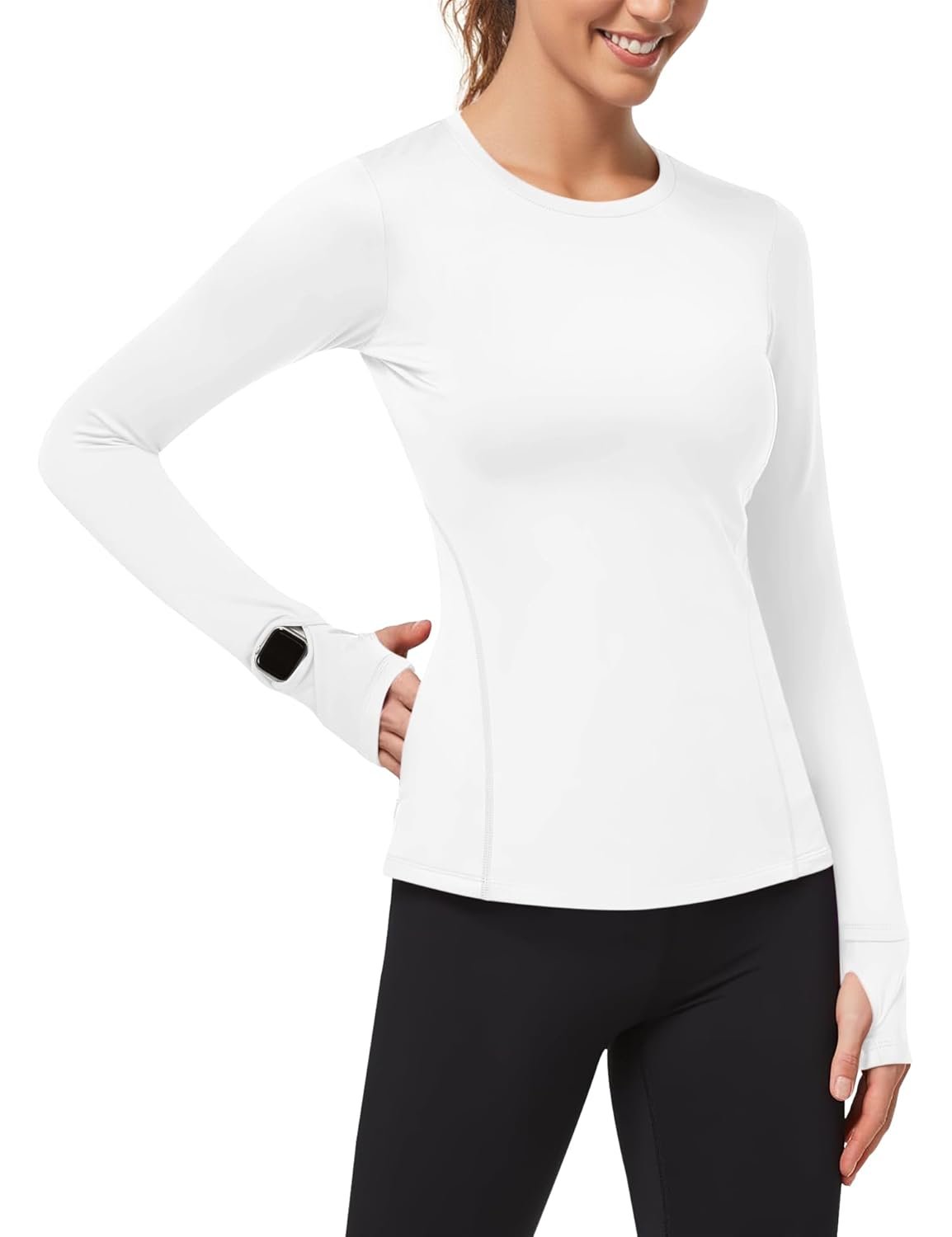 - 【Design】The running shirt has 2 hidden watch windows on the wrist, allowing you to easily check the time or fitness tracker while exercising without having to pull down the thumb holes.Curved hem for a casual style that pairs perfectly with yoga pants.