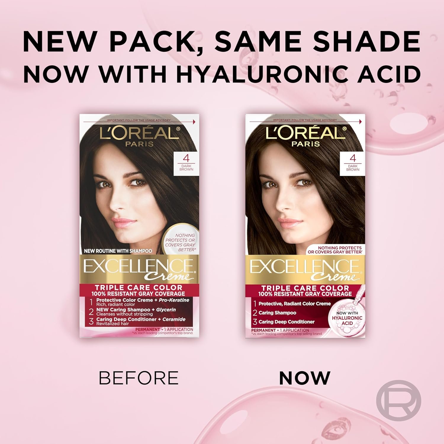 L’Oreal Paris Excellence Crème Permanent Hair Dye, Triple Care Hair Color with Hyaluronic Acid for 100% Gray Coverage, 4 Dark Brown, 1 Kit (Packaging May Vary)