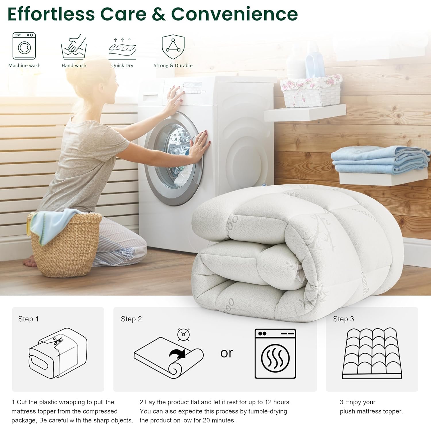 - Machine Washable & Easy Care: Our mattress protector is easy to clean. The mattress cover can be cleaned in the washing machine at low temperature. Tumble dry on low. Please do not iron and do not dry clean. For optimum fluffiness, you can tumble dry it on low heat before using it. Expensive dry cleaning is not required.