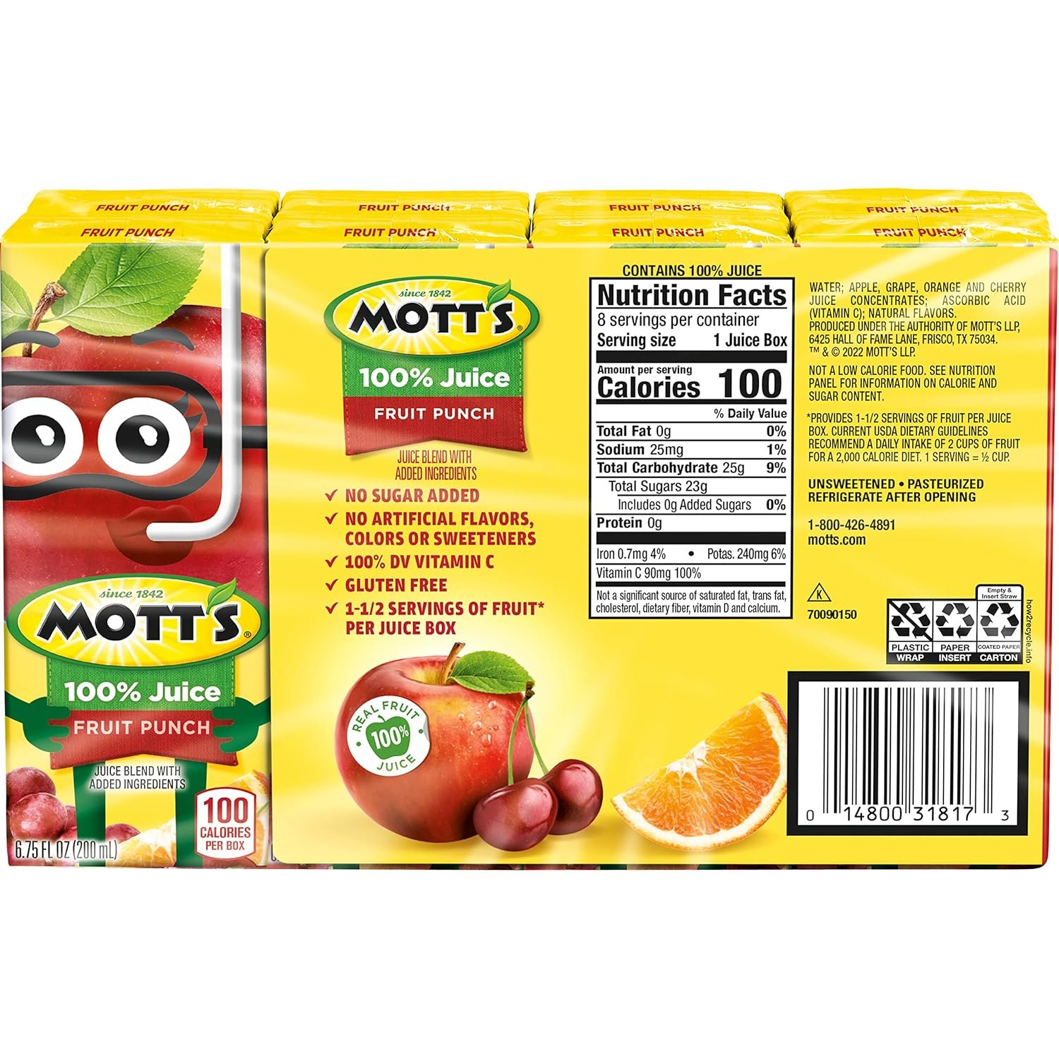 - NATURAL GOODNESS: Mott’s 100 percent Fruit Punch Juice is gluten-free, caffeine-free, non-GMO, Kosher, and contains no artificial colors or sweeteners