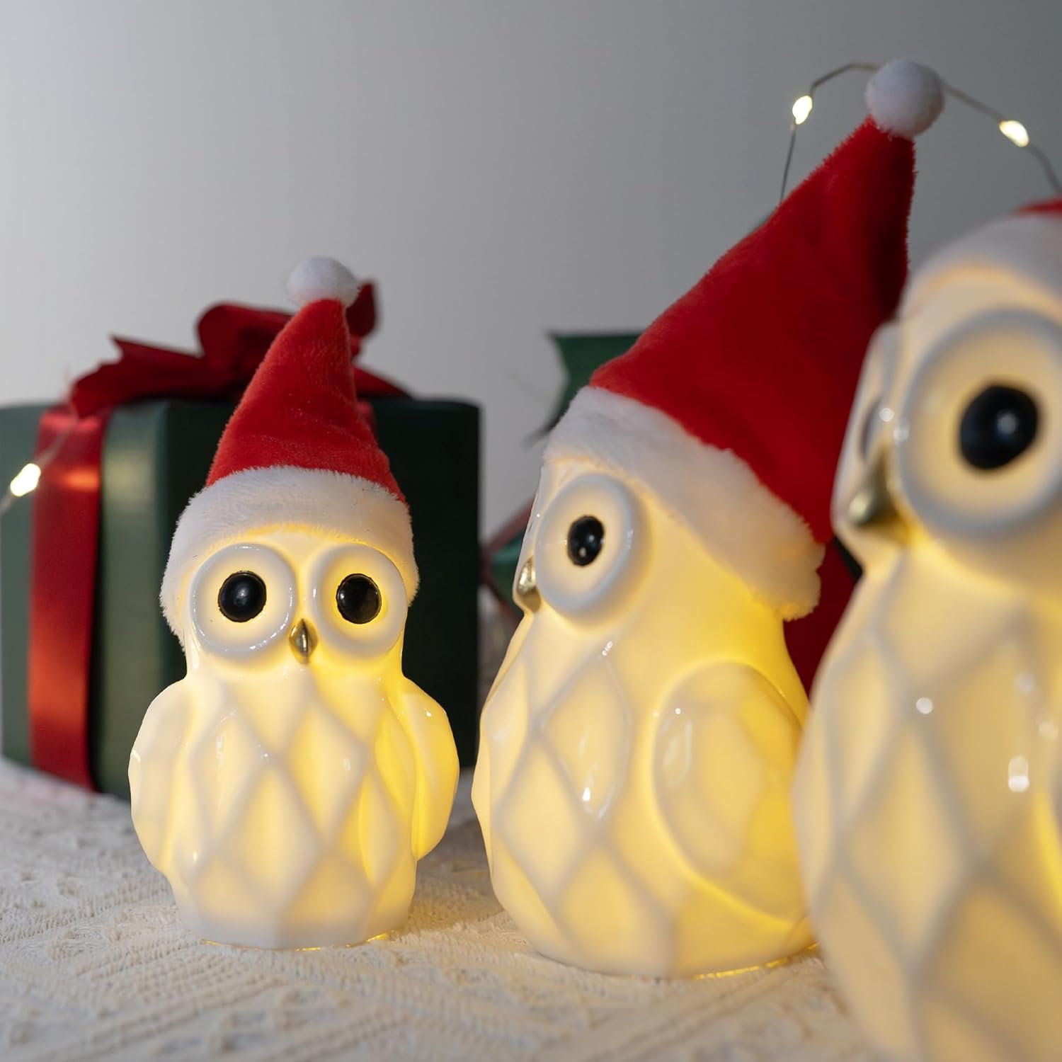 - High-Quality Craftsmanship: Made from high-quality ceramic material, these owl figurines are durable and easy to set up and store for future use. They are ideal for indoor Christmas decorations, suitable for both daytime and nighttime display. The detailed craftsmanship ensures that each owl is beautifully designed and finished, making them a great addition to your Christmas collection