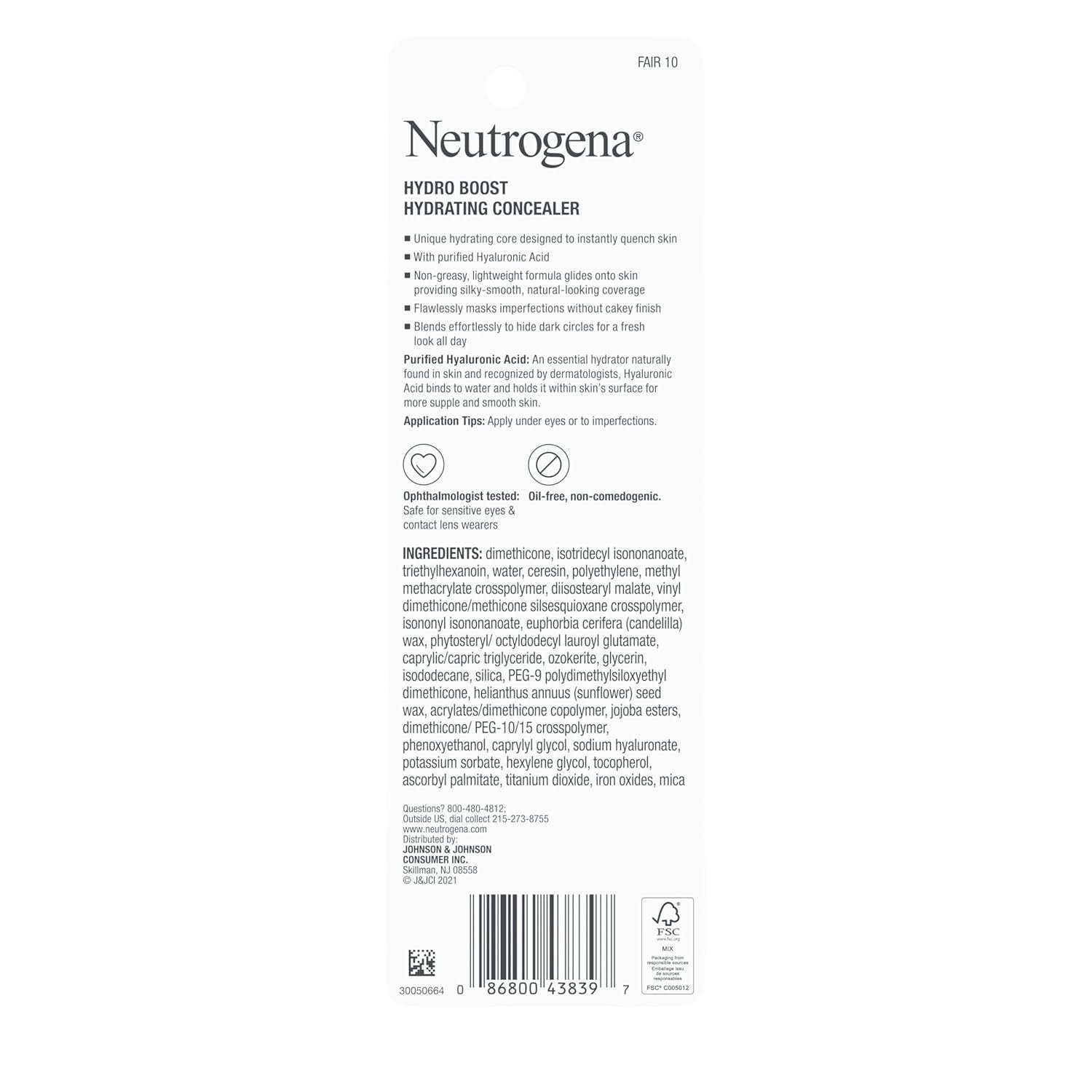 - Neutrogena Hydro Boost 0.12-ounce Hydrating Concealer Makeup stick in the shade Fair 10 to help hydrate & refresh dry, thirsty skin while providing smooth & buildable coverage