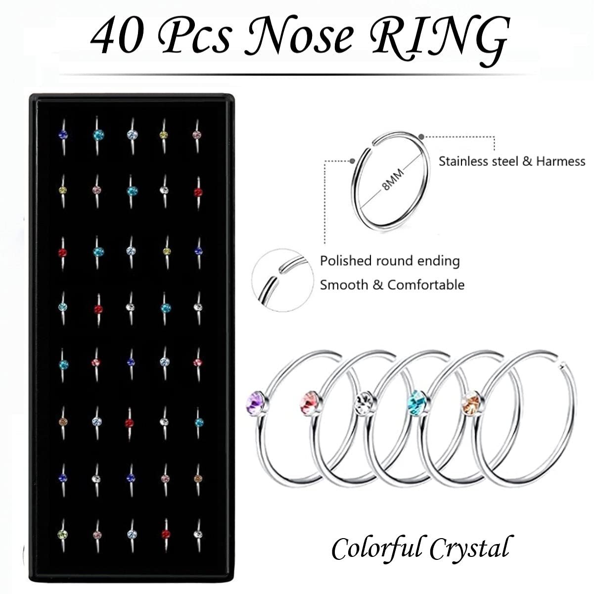 - ❸ Creative Design✔ ➤7mm wearable length and 1.5/2/2.5mm crystal of 120 pcs white and multicolor Nose studs. 8mm diameter and 22 Gauge 22g thickness of 40 pcs colorful Nose rings. There are 3 sets in total available. Ideal Gift for Women, Girlfriend, Wife, Daughter or Daily Wear.