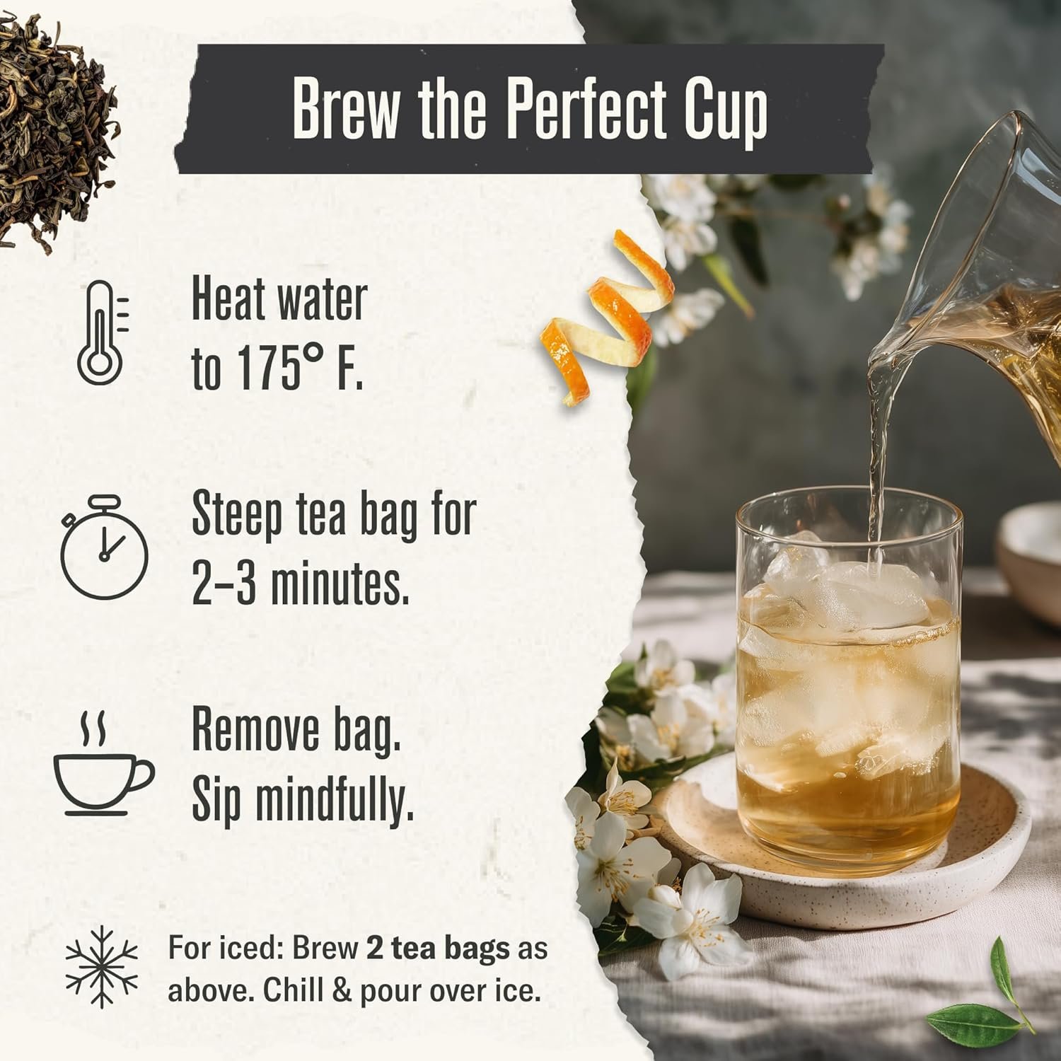 - Timeless Tea Ritual: Jasmine green tea celebrated for centuries; smooth and aromatic with a lingering floral finish; energizes gently while offering calm clarity; enhances mindfulness and daily wellness routines; microplastic free bags and compostable packaging underline a commitment to sustainability