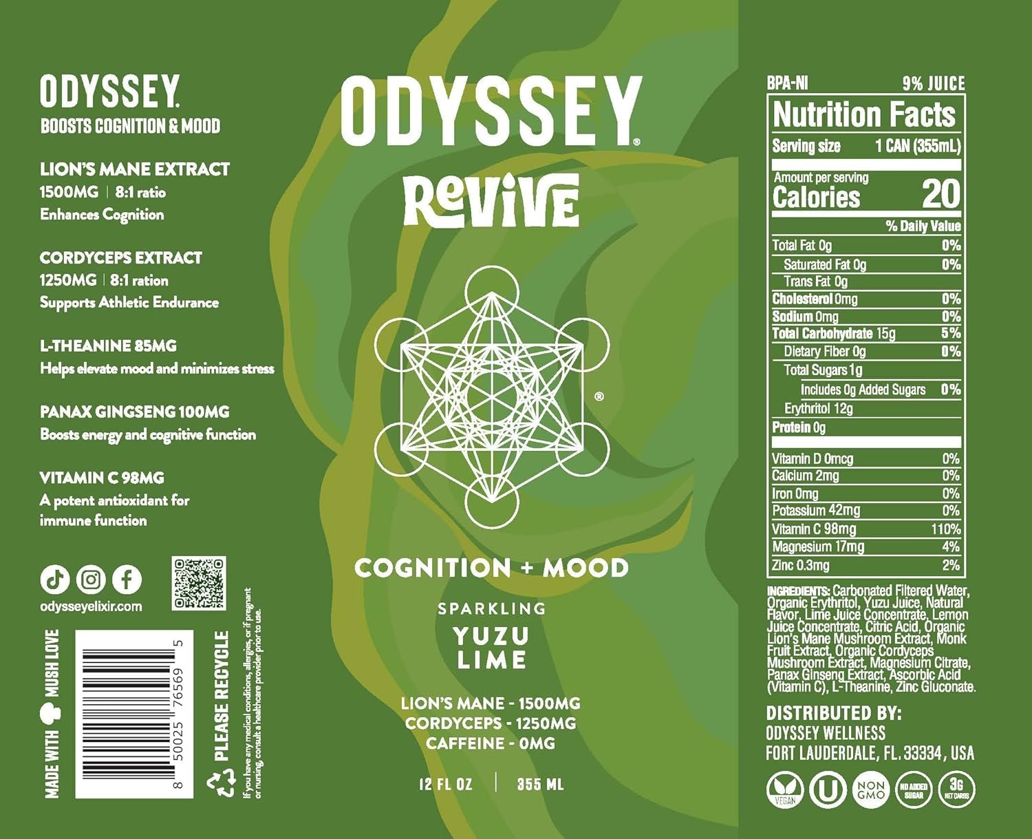 Odyssey Revive Sparkling Drink – Caffeine Free Electrolyte Water with Lion’s Mane Cordyceps L-Theanine and Vitamin C – Instant Hydration for Wellness – 12 Pack Yuzu Lime Flavor,…