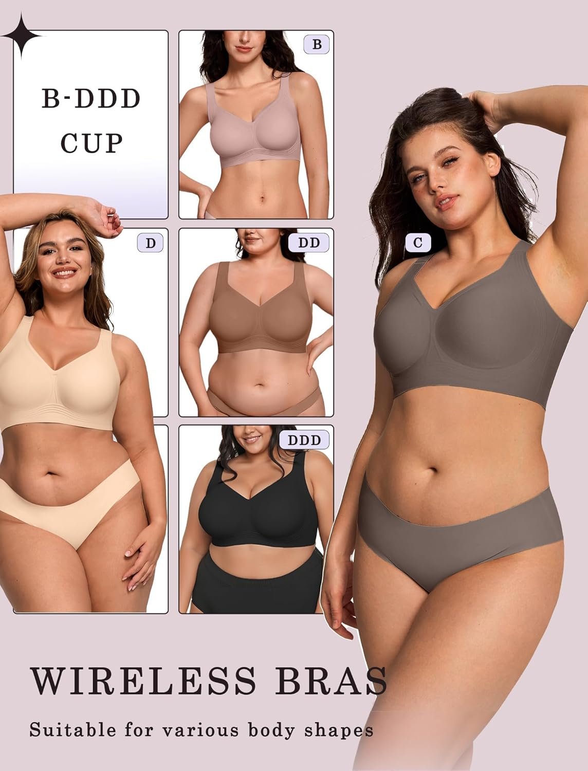 - Back-Smoothing Design – This wireless bra combines an innovative widened side wing design with a 5-row, 4-buckle back closure (plus free extender) for adjustable support. Its U-shaped back and widened side wings seamlessly smooth back fat and underarm bulges. The high side ratio design securely wraps fuller busts to prevent side spillage, and the semi-fixed padding stays perfectly in place during both wear and washing for effortless comfort.