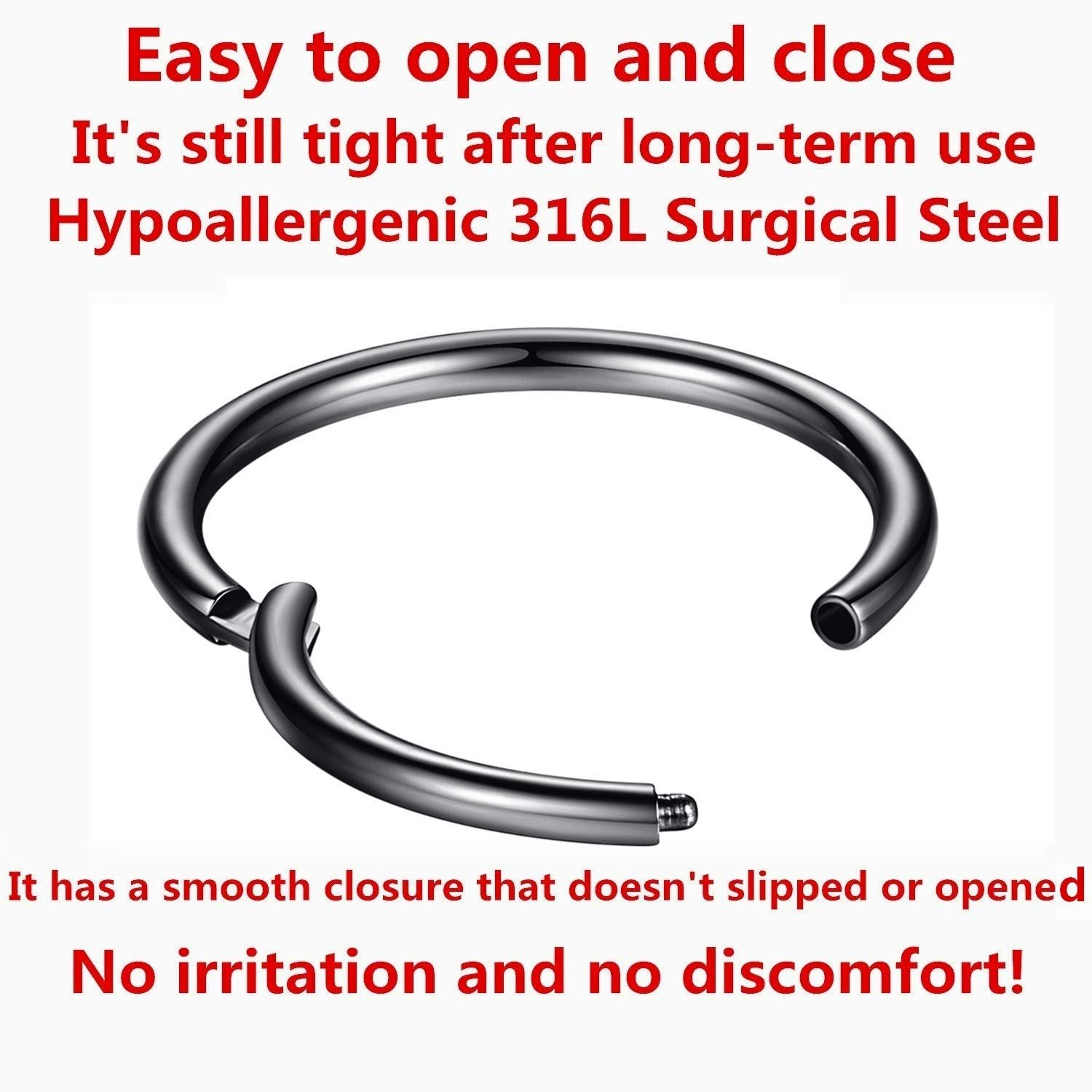These nose rings are exactly what I was looking for. The 18-gauge size is comfortable, and the hinged closure makes it super easy to put in and take out. The 316L surgical steel hasn’t irritated my skin at all, and the finish still looks shiny after weeks of wear. It stays securely in place and feels lightweight but durable. For the price, the quality is really impressive — definitely one of the best nose hoops I’ve bought online. Highly recommend!
