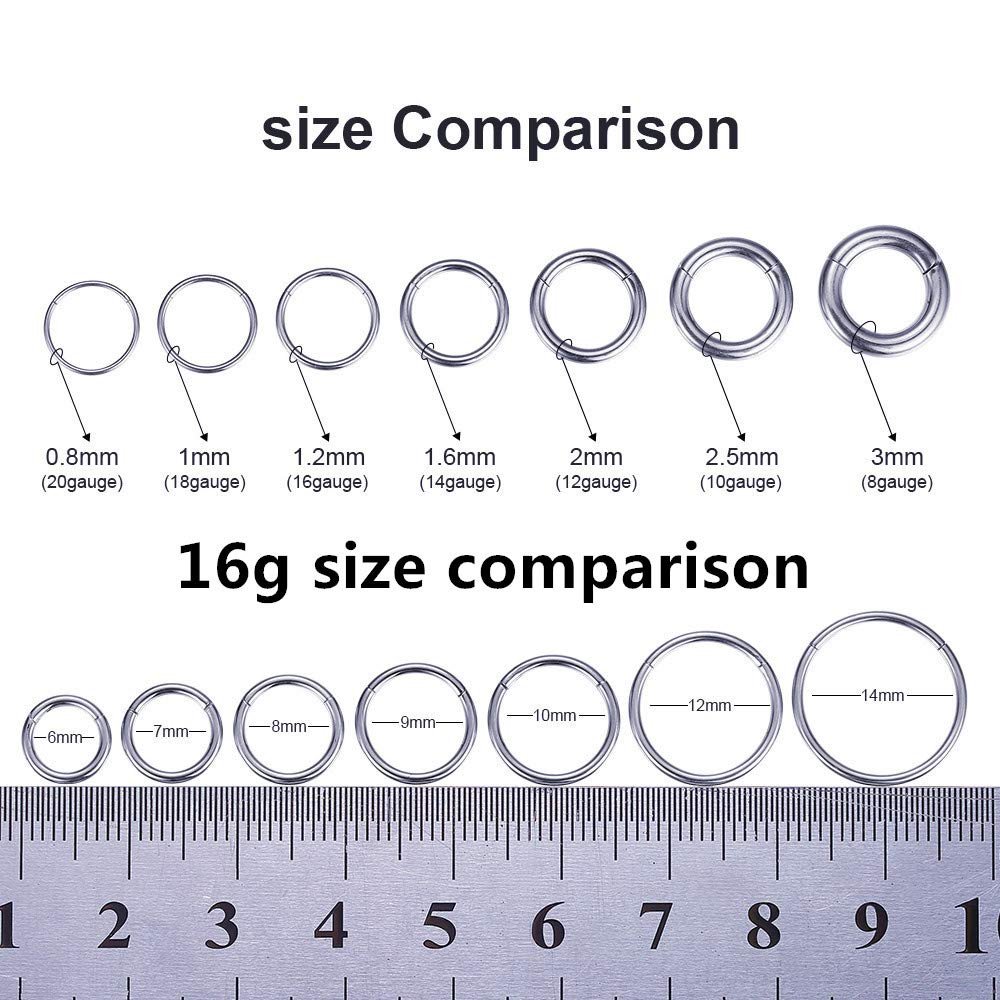 - Sold individually Nose Hoop Ring/Earring Hoop Size: 16 gauge (thickness: 1.2mm), inner diameter 5/16 inches(8mm ),Please choose your gauge and diameter hoop for your nose piercing needs.It has a smooth closure that doesn’t slipped or opened. It’s still tight after long-term use.