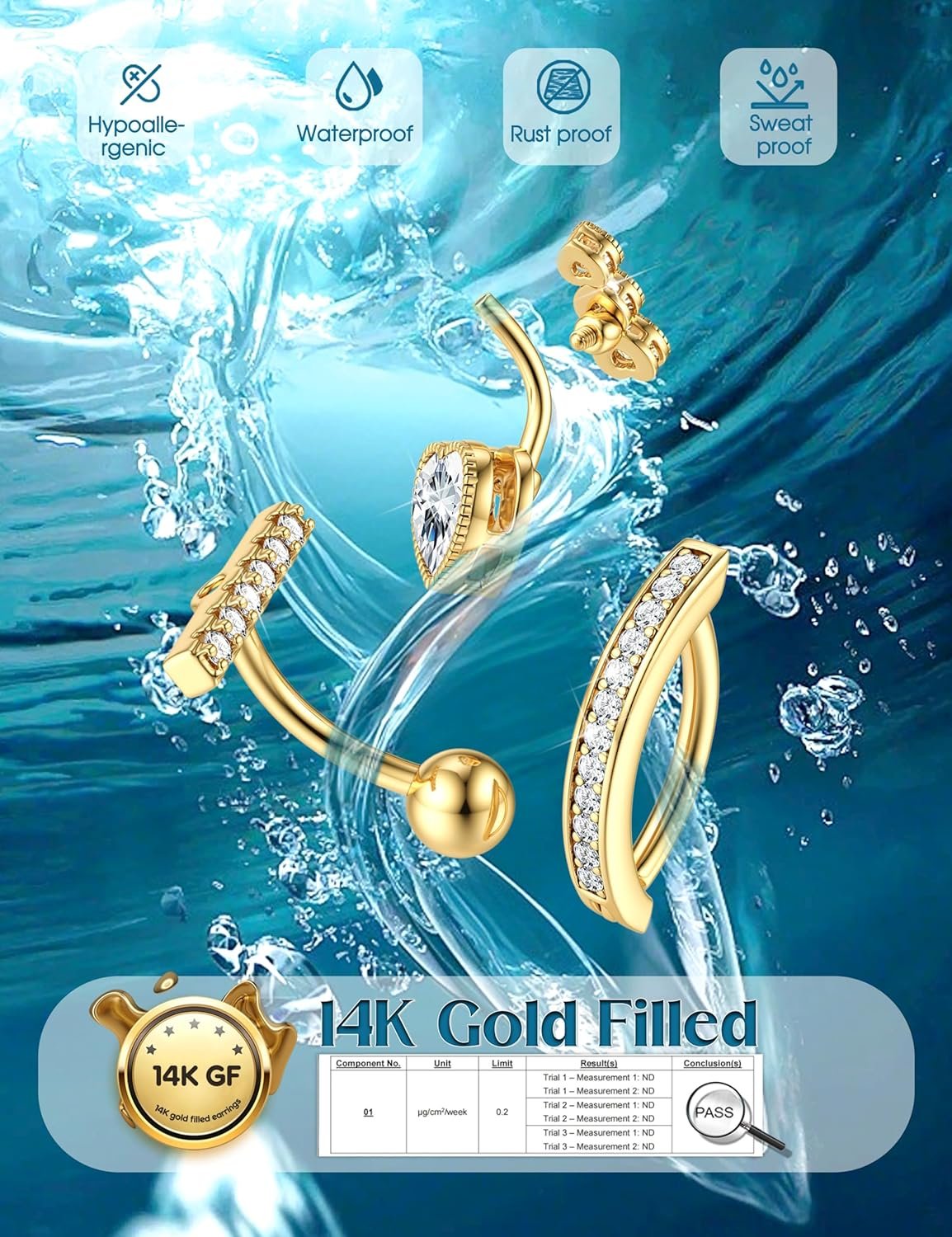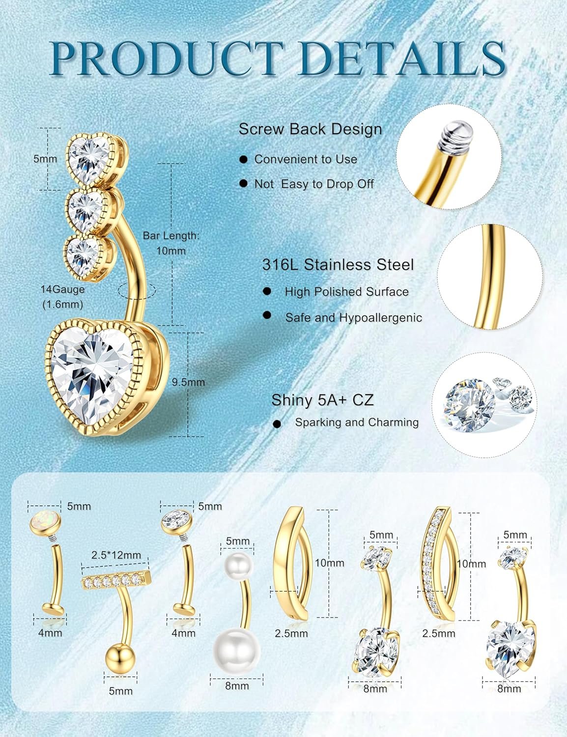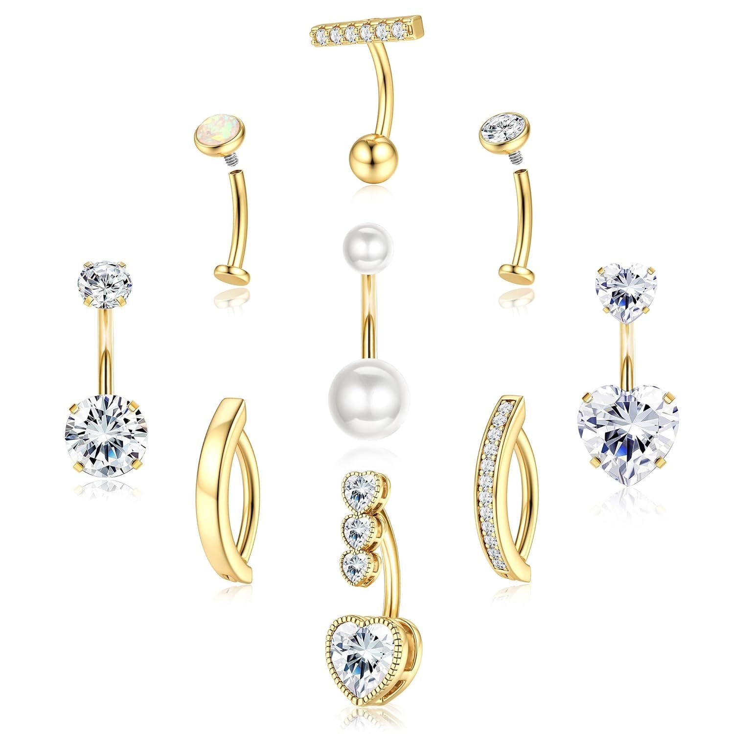This belly button jewelry set is a nice mix of styles, giving you options for different looks. The gold-tone finish looks clean and pairs well with both casual and dressy outfits. Some pieces are simple and smooth, while others have gems or pearls for extra sparkle, so you can switch them out depending on your mood. The set feels lightweight and comfortable, making it easy to wear for longer periods. Good variety for the price and great if you like to change up your look often.