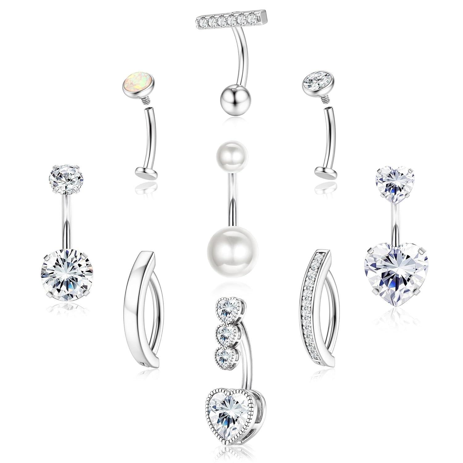 FIASASO 9 Pcs Belly Button Ring – Surgical Stainless Steel CZ Belly Rings Clicker Belly Piercings for Women Navel Piercing Jewelry Pack