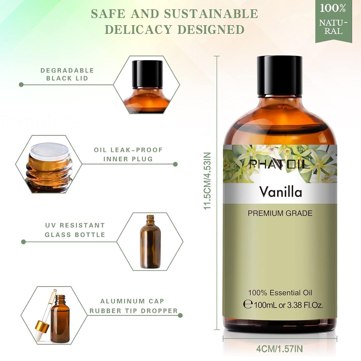 PHATOIL 100ML Vanilla Essential Oil, Huge 3.38fl.oz Bottle Vanilla Oil, Pure Aromatherapy Essential Oils for Diffuser, Humidifier, Scented Oils for Soap, Candle Making