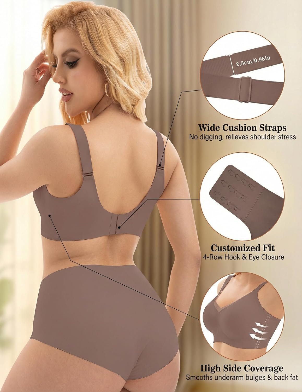 - Customize your fit in this wireless bra with adjustable shoulder straps and a 4-row hook closure, plus a free extender to accommodate body changes. This wireless bras versatile design transitions effortlessly from work to yoga to sleep, offering all-day comfort.