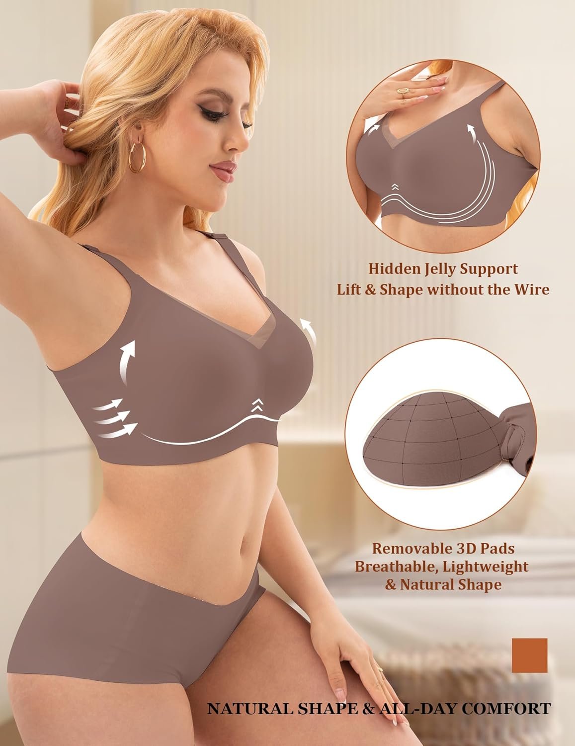 - Semi-Fixed 3D Contour Cups: Enjoy customizable coverage perfect for a wireless pushup bra for women or lighter feel. Pads stay securely in place or can be easily removed. This dual-option design adapts to your preferences, ideal as wireless push up bras for women.