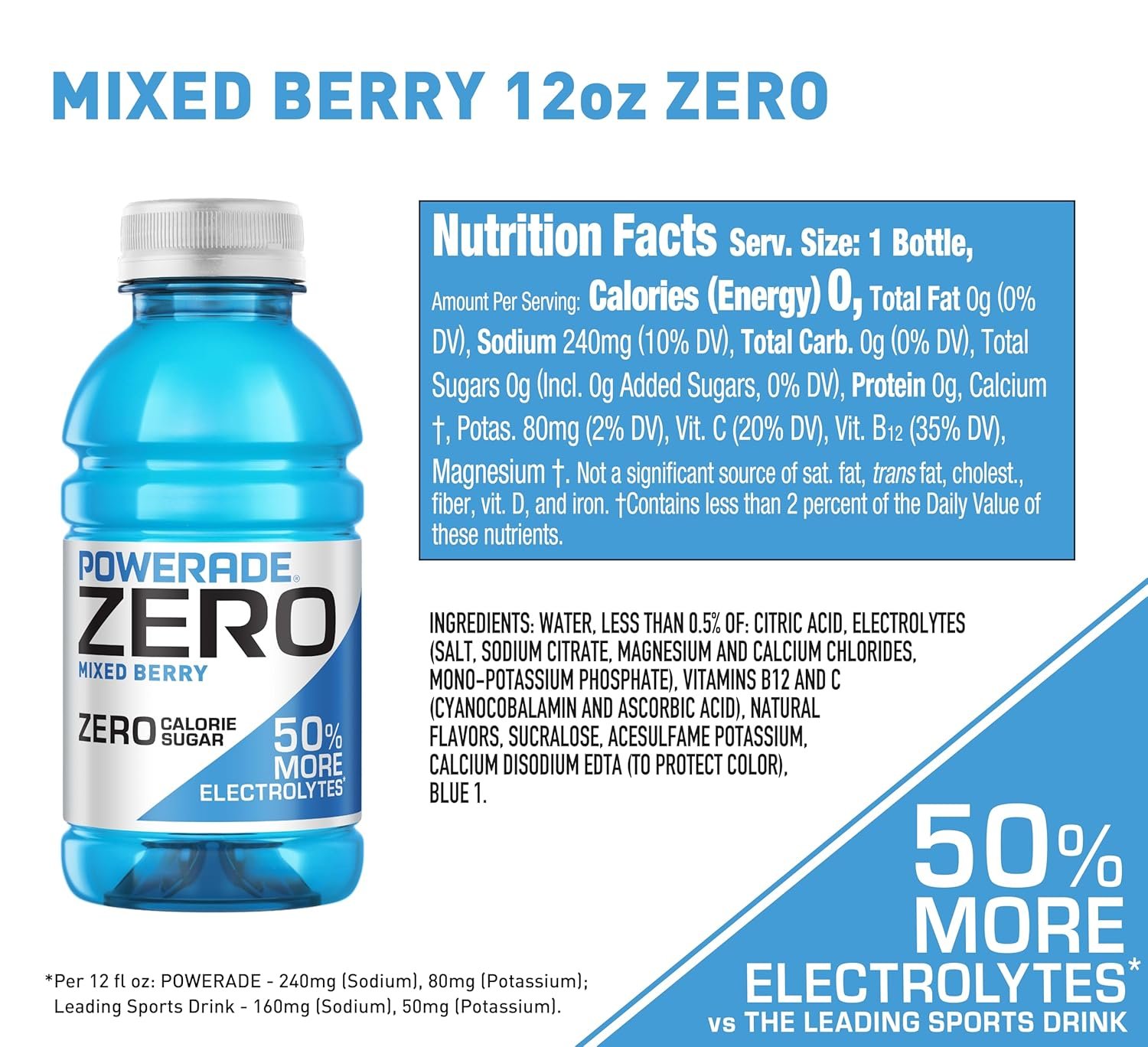 - Outmuscle and replenish – POWERADE electrolyte drinks contain 50% more electrolytes versus the leading sports drink [Per 20 fl oz: POWERADE – 400mg (Sodium), 130mg (Potassium); Leading Sports Drink – 270mg (Sodium), 80mg (Potassium)]