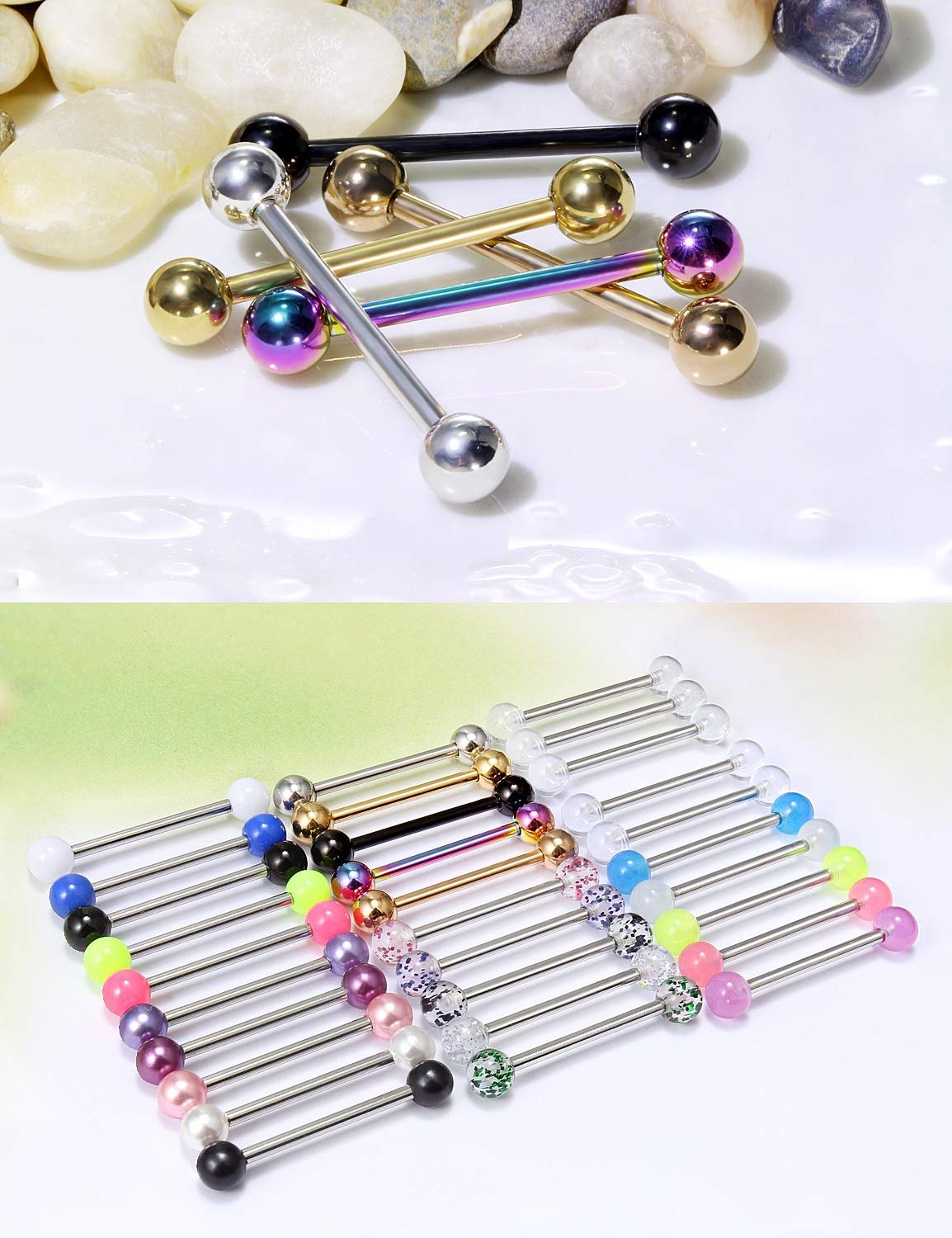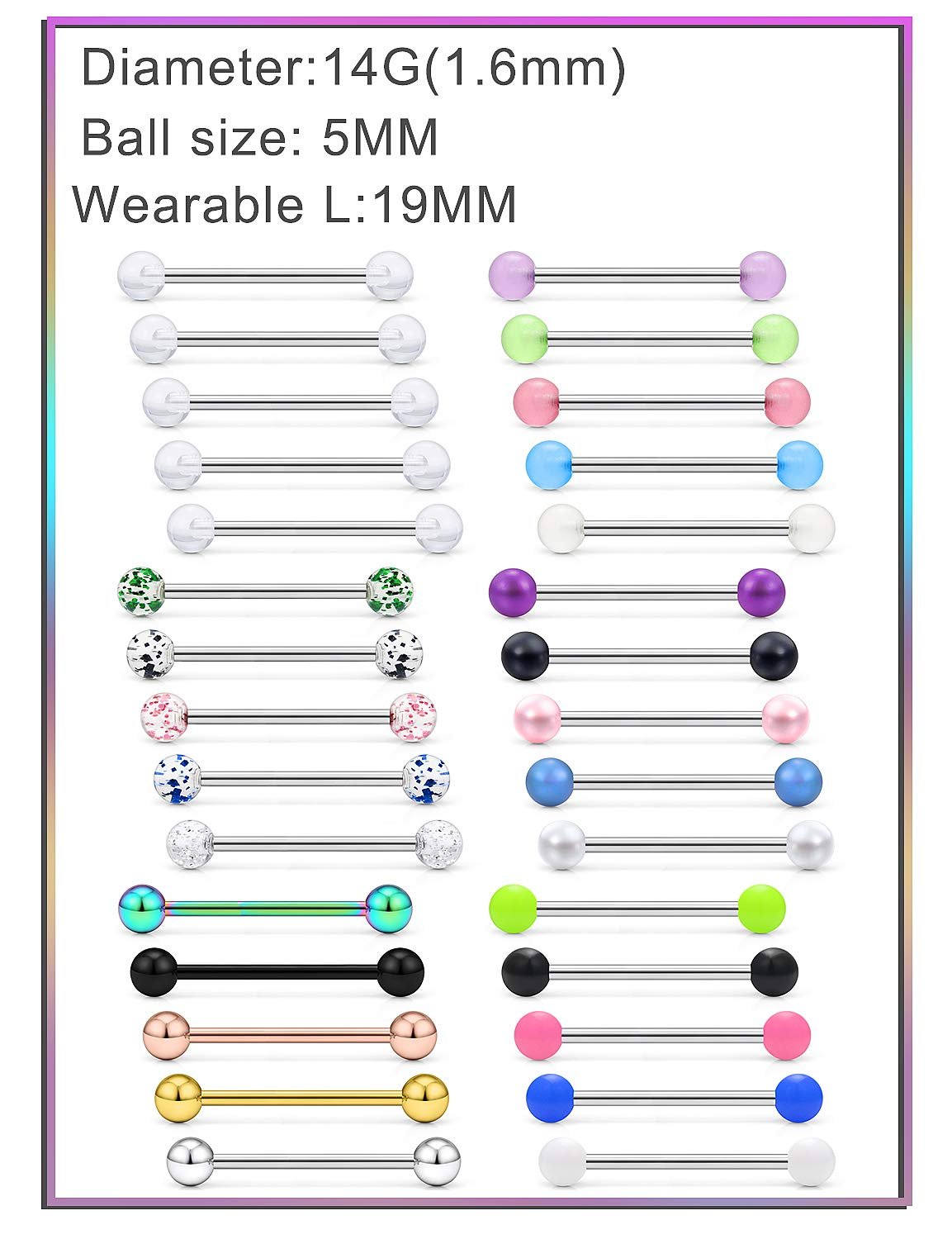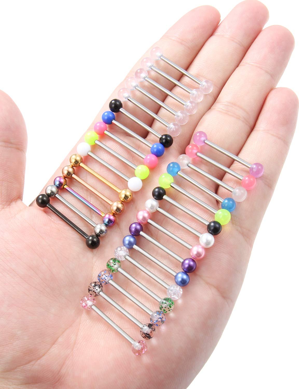 - ☍VALUE PACK☍ Set Includes 30PCS Surgical Steel Straight Barbells,6 Different Designs(5PCS Per Style):① Multicolor(Silver,Black,Gold,Rose-Gold,Rainbow) Steel Balls,② Multicolor(White,Black,Royal-Blue,Hot-Pink,Blue-Violet) Artificial Pearls,③ Clear Acrylic Balls,④ Multicolor(Silver,Black,Blue,Green,Hot-Pink) Glitter Balls,⑤ Multicolor(Silver,Green-Yellow,Medium-Orchid,Dodger-Blue,Hot-Pink) Acrylic Glow in the Dark Balls, ⑥ Multicolor(White,Black,Green-Yellow,Royal-Blue,Hot-Pink) Solid Acrylic.