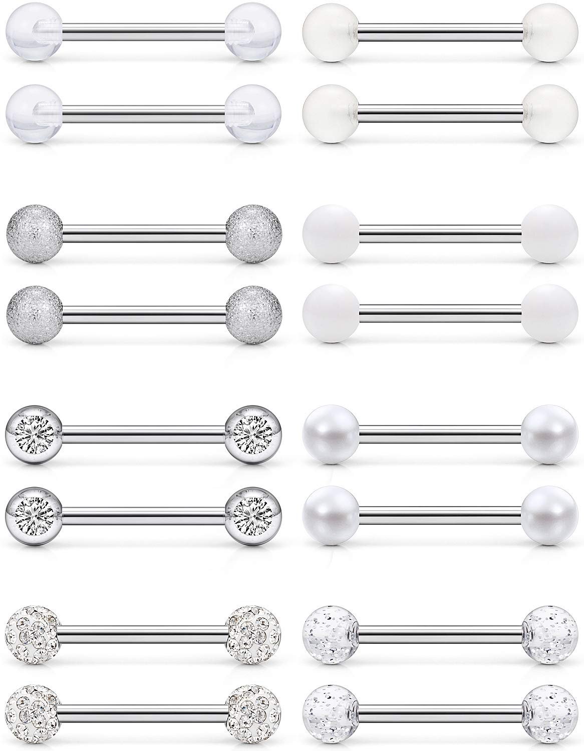 Prjndjw 8-12Pairs 14G 16G Nipple Rings Surgical Steel Tongue Rings Barbell Nipplering Diamond CZ Body Piercing Jewelry Retainer for Women Men 14mm Length Size