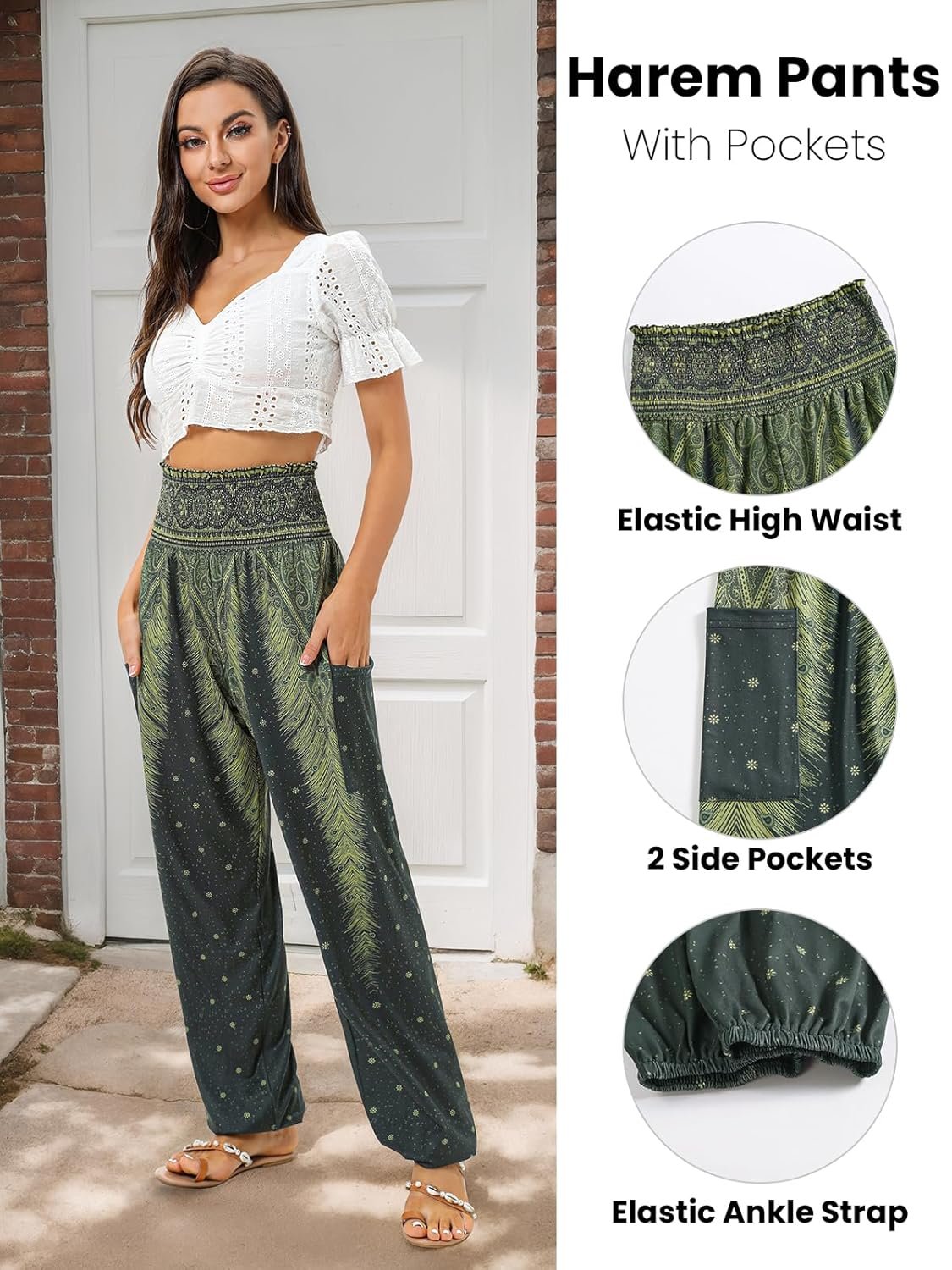 - Features: Women harem pants boho palazzo hippie floral yoga trouser, High waist design, with a combination elastic in waist,Elastic waist and ankle.2 large side pockets Loose style boho pants fit for many shapes. Simple and classic style .