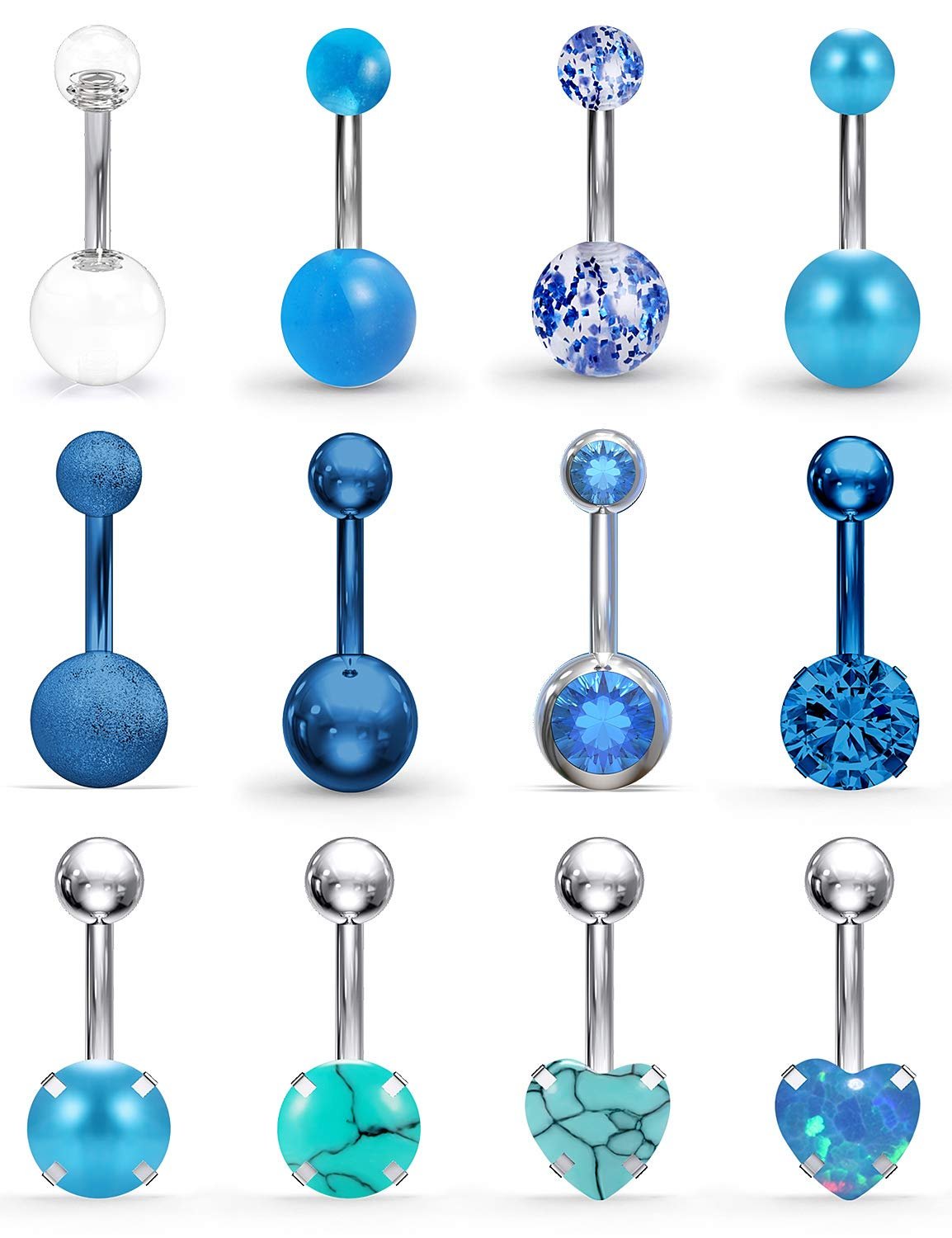 - Including 12PCS Belly Button Rings, Mix-Styles(Jeweled CZ,Shinny Balls,Matte Ball,Clear Acrylic Balls,Gilitter Balls,Glow in Dark Balls,Pearl Balls,Prong-Setting Heart Opal,Prong-Setting Pearl,Prong-Setting Round Natural Stone,Prong-Setting Heart Natural Stone,Prong-Setting Clear CZ,Each Style One Piece). Reasonable Price For Body Jewelry,Deserve To Purchase.
