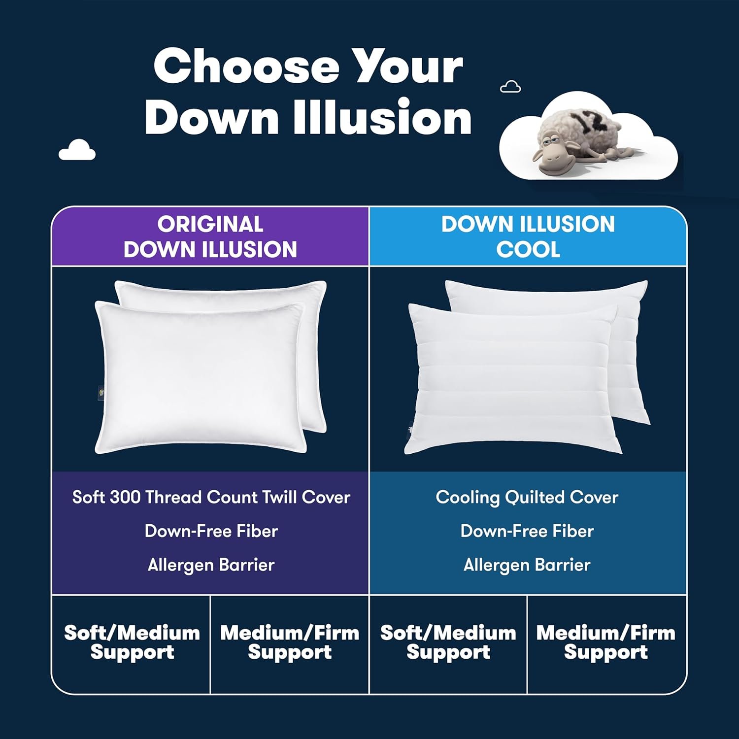 I highly recommend the cooling version of these pillows in soft/medium in King or Queen. I have both sizes. These are the best pillows I have ever owned, and I actually purchased backups because I never want to be without them. They are actually cool to the touch, but you may need to flip them every once in a while to keep them cool during the night. For a truly heavenly experience, pair these with Rest Evercool pillow cases. They are expensive but worth it, especially when paired with these cloud-like pillows. I just wish Serta would make a body pillow and leg pillow in this same design