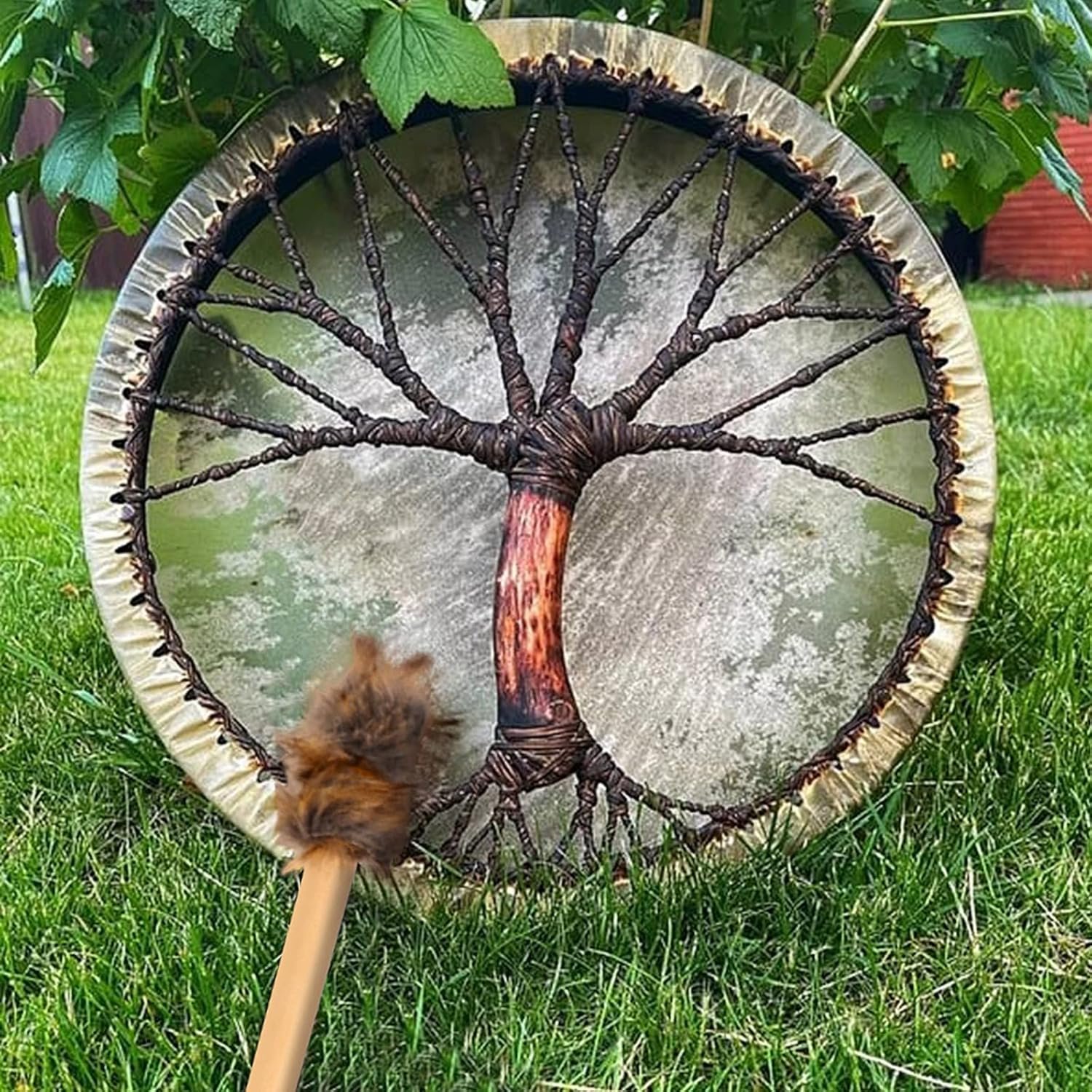 Cheap, not the same drum in the picture, sounds worse than a child’s toy, the tree is like a blurry printed cut out that doesn’t even come close to the original pictures, i’m not sure where the leather is on this product and it was definitely not handmade. One of the most disappointing things I’ve ever gotten from Amazon.