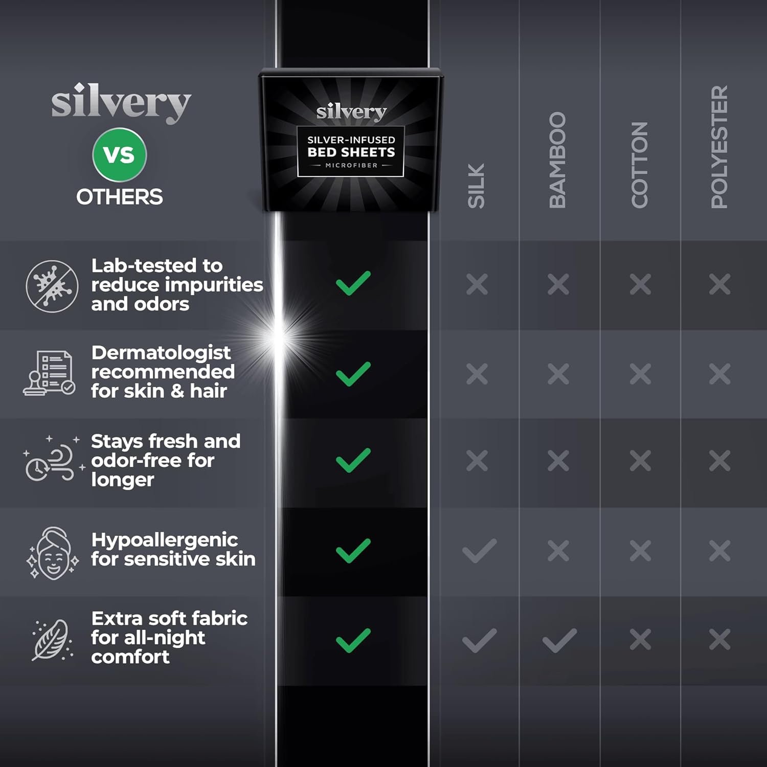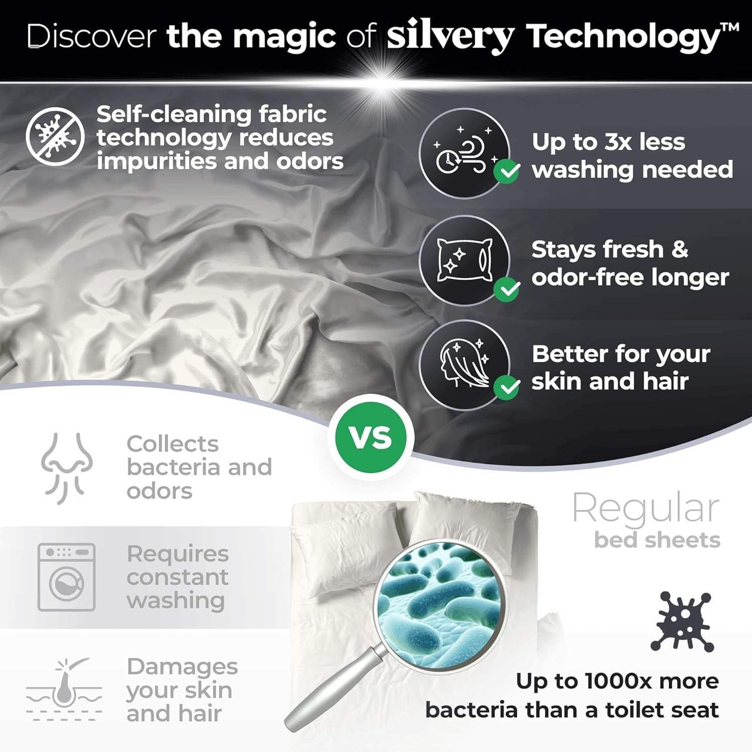 - REVOLUTIONARY SELF-CLEANING TECHNOLOGY: Lab-tested to reduce 99.9% of specific impurities, Silvery Bed Sheets stay fresh 3x longer than traditional sheets, reducing the need for frequent washing. Dermatologist-recommended for sensitive skin and smoother hair.