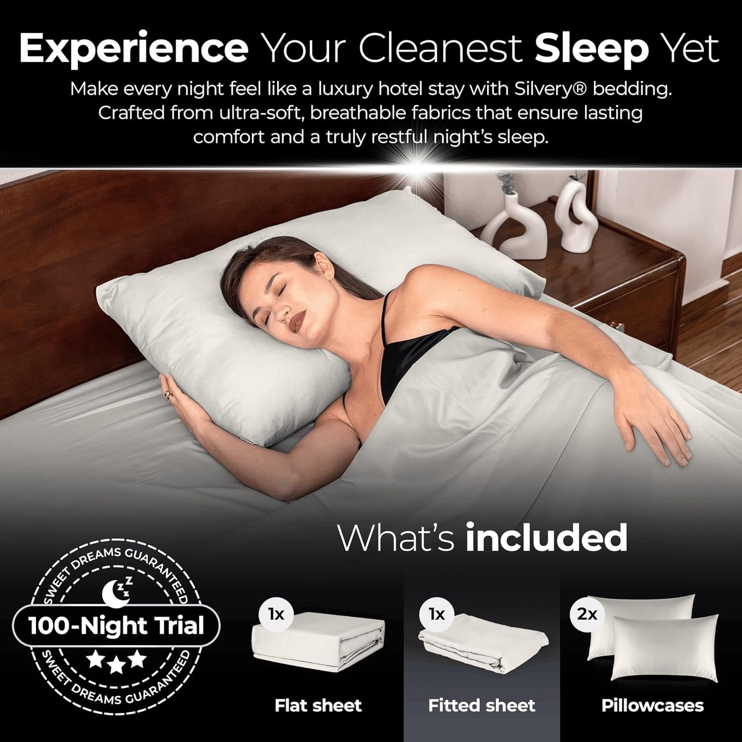 - SWEET DREAMS GUARANTEED: Experience your cleanest, most comfortable sleep yet without compromising on luxury. Try Silvery Bed Sheets for 100 nights, and if you’re not completely satisfied, simply return them. Join over 25,000 satisfied customers who’ve already upgraded their sleep.