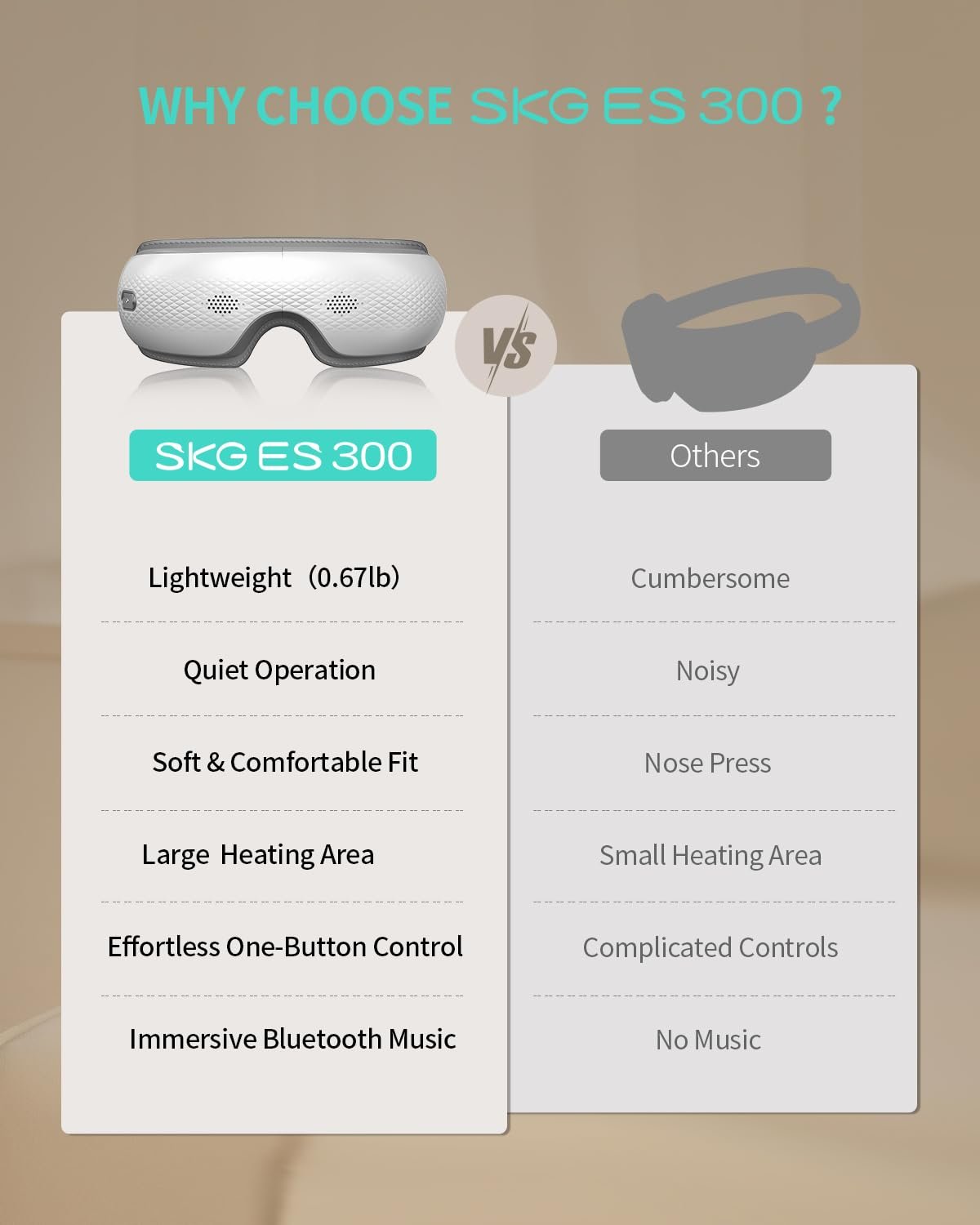 Thanks to SKG Massages, the device is both comfortable and effective. It fits perfectly over the eyes, has five different massage modes, and even plays soothing music. The designed looks good. It as a long battery life too. Noise level is very low