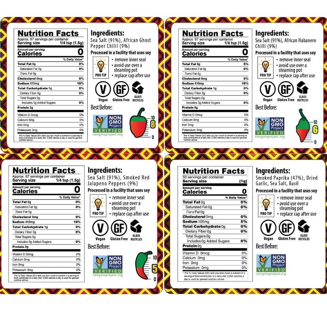 African Dream Foods Spicy Salts and Seasonings, 4 pack, provides a nice variety of flavors that can make bland or ordinary foods so much more appealing. These are versatile seasonings, good for recipes or just sprinkling on foods.