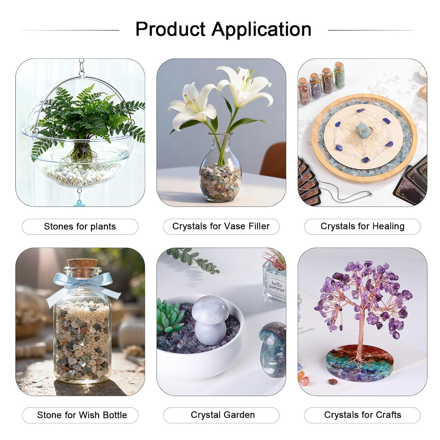 - Chip stones are polished and irregular, undrilled, no hole, no clasp, no core, small size range from 0.1″-0.5″, the crushed pieces are also use for offering bowl, houseplants, vase filler, jewelry making, wishing bottle, inlay wood works, art design or other DIY projects.