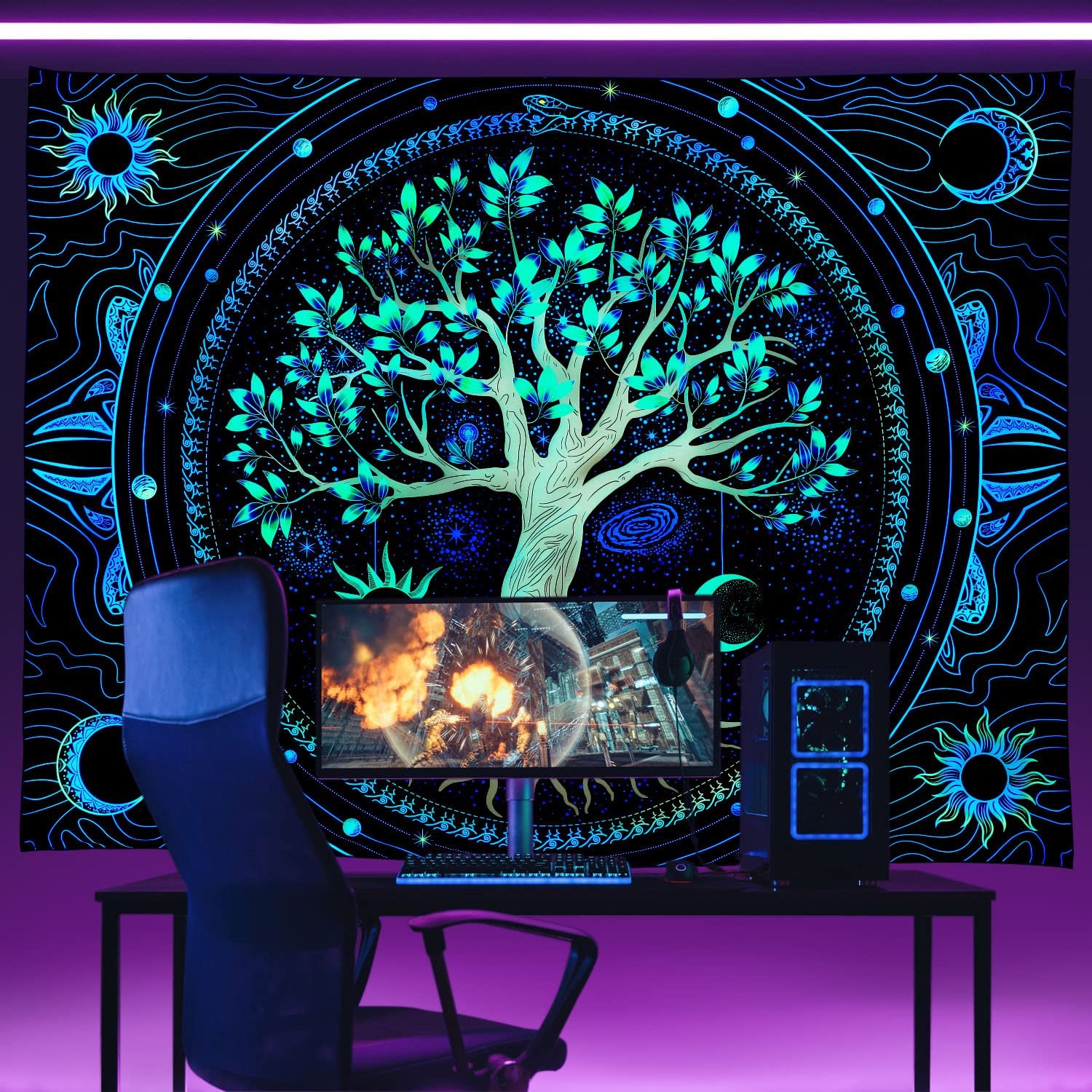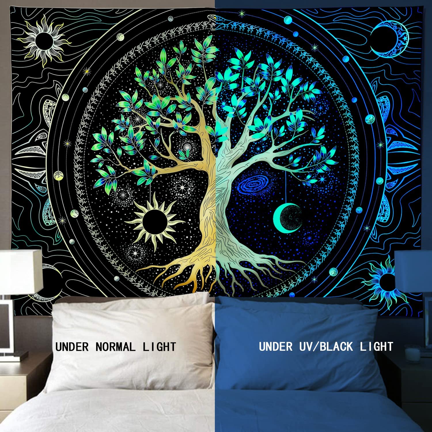Tapestry for Bedroom Aesthetic Black Light Tree of Life Tapestrys UV Reactive Trippy Talestry Colorful Wall tapistry Sun Moon Space Tapestries Green Forest Wall Hanging Decor…