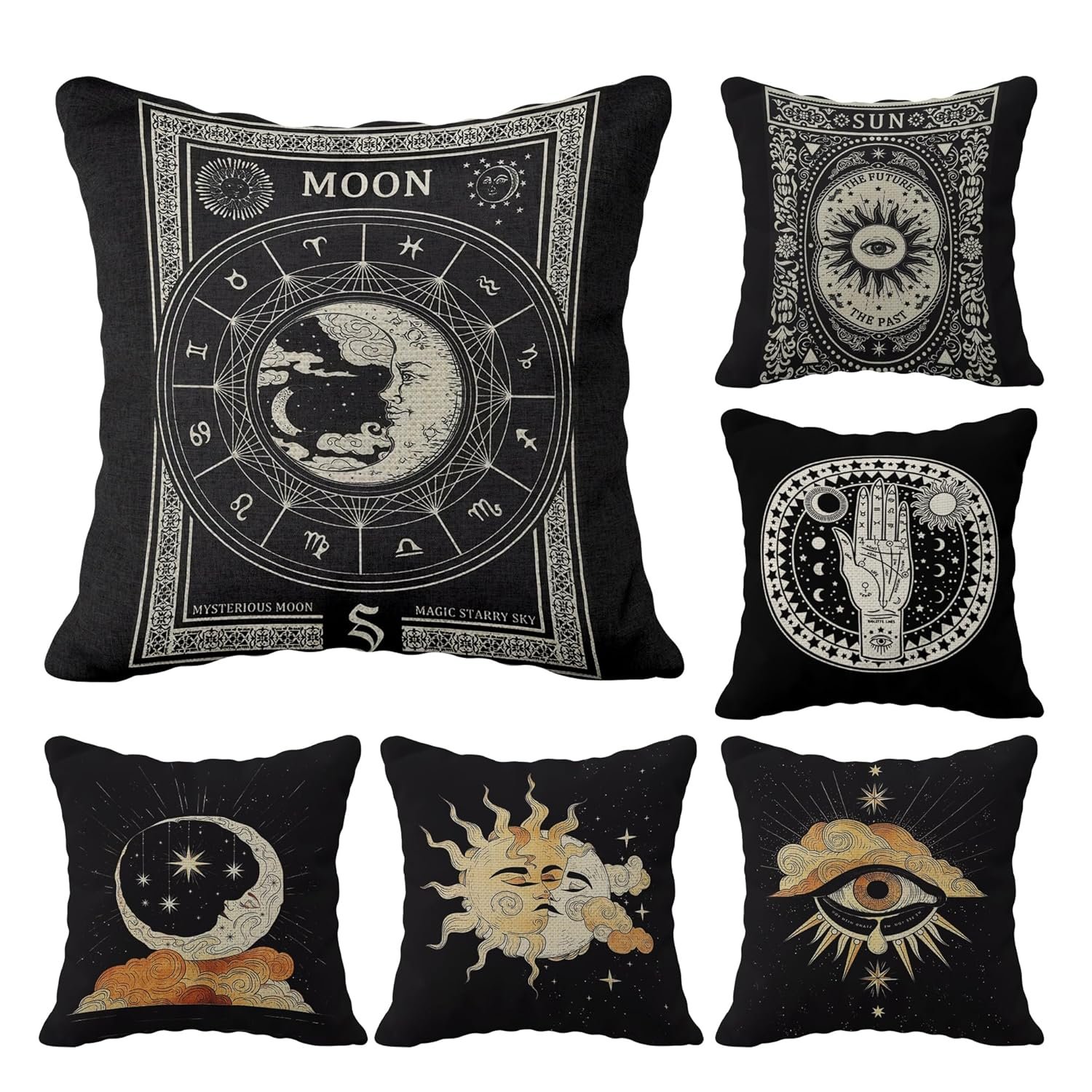 Tarot The Star Moon Sun Linen Throw Pillow Case, 18 x 18 Inch Set of 6, Tarot Theme Room Decor, Astrology Tarot Lovers Gifts, Mom, Daughter, Sister, Wife Gifts, Black Cushion…