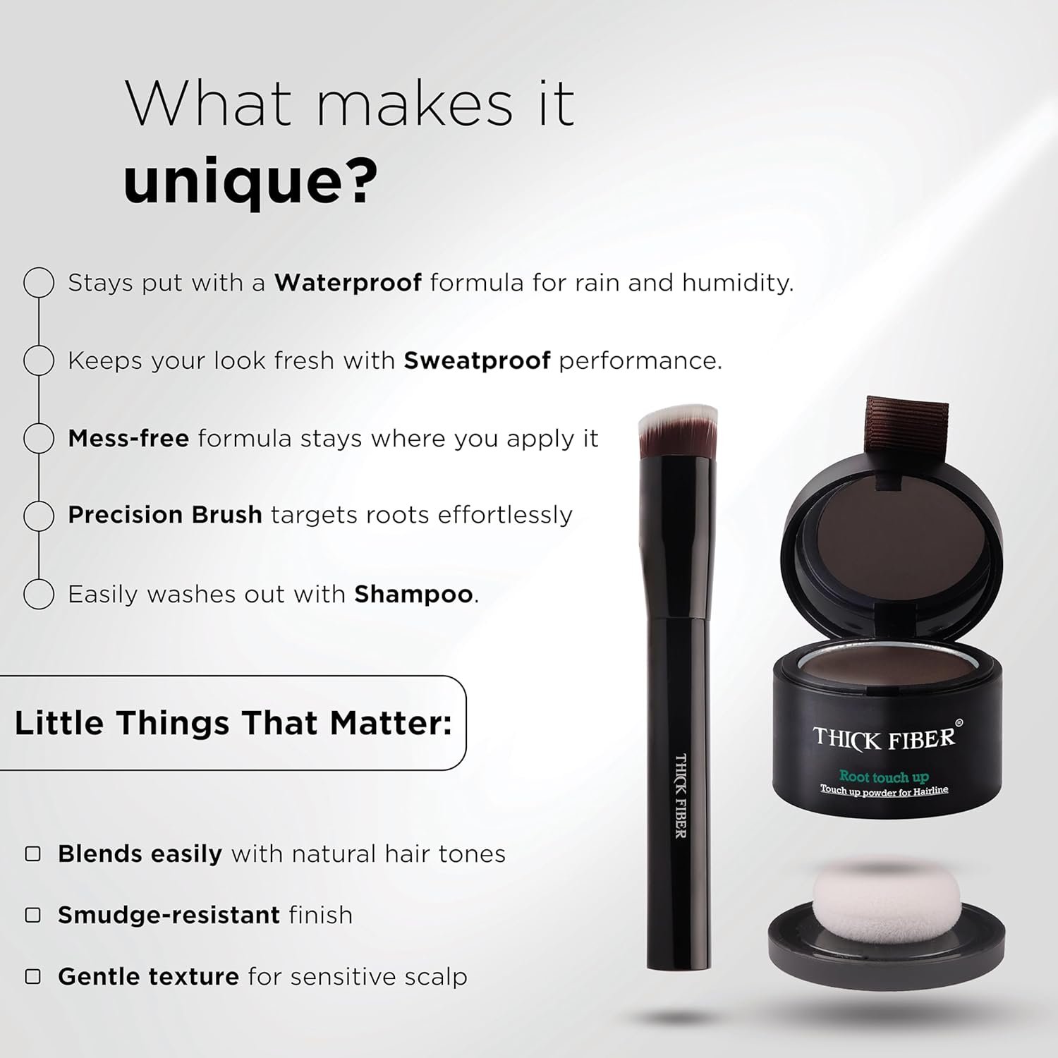 - INSTANTLY CONCEALS THIN HAIRLINE AND COVERS GRAY ROOTS: The THICK FIBER Root Touch Up Powder is your secret weapon for effortlessly concealing thin hairlines and those unwelcome gray roots. With a few quick strokes, watch as the hair concealer powder works its magic, providing you with instant coverage that camouflages imperfections and boosts your hairline’s fullness.
