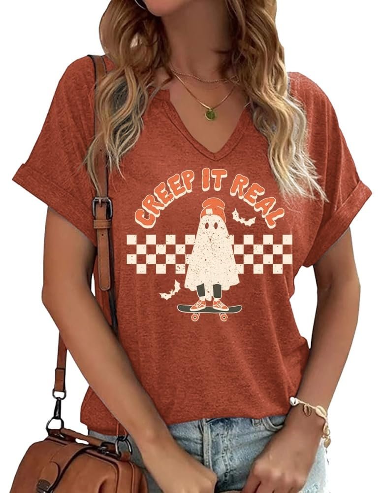 Cute Halloween T-shirt. Love the burnt orange color. Fits true to size and comfortable. Received compliments on color, fit, and cute ghost design.