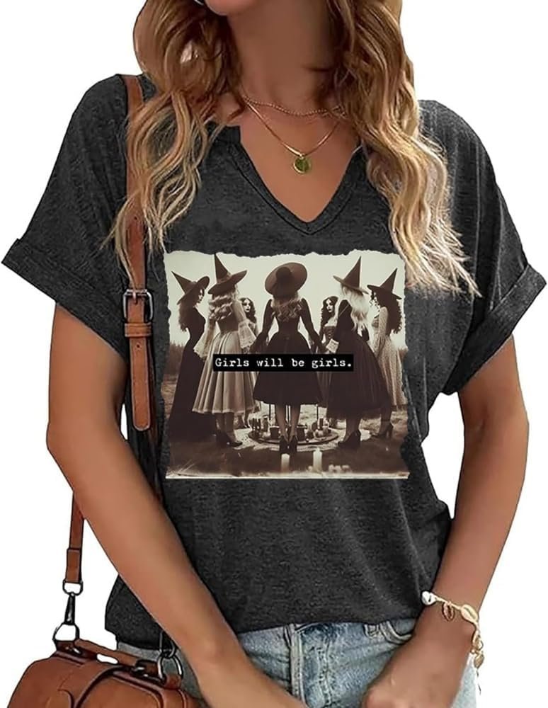 - Womens Fall Halloween Witch V Neck Shrt Funny Feminist Witch Graphic Short Sleeve Tee Girl Power Holiday Autumn Tops