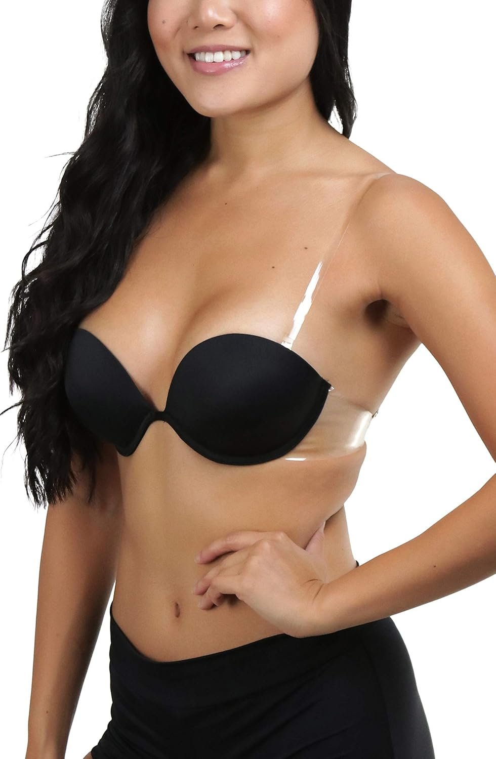 This bra is exactly what I was looking for! I ordered a dress with a very very deep V (LouKeith Womens Deep V Neck Sleeveless Zipper Back Evening Party A-line Dress Plum M) and the bra is perfect. I made the straps the longest they can be so that the band around my ribcage sits very low and all you can see around the dress are the bra straps, which I personally don’t care about.