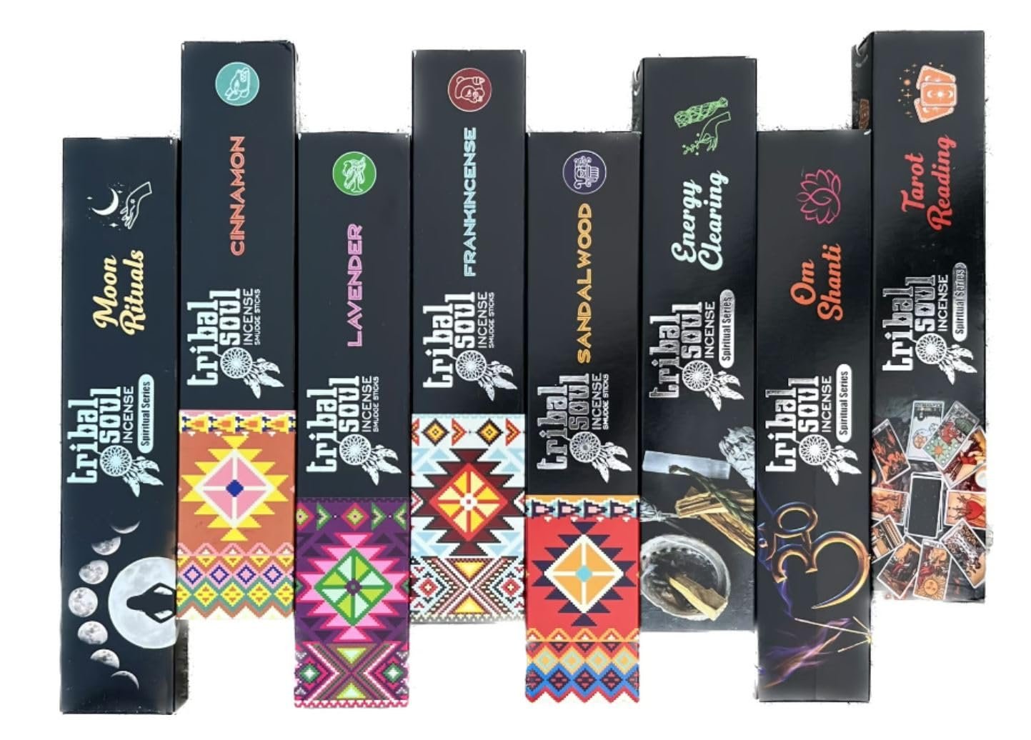 - GIFT SET: Set of 8 Scents Moon Ritual, Cinnamon, Lavender, Frankincense, Sandal Wood, Energy Clearing, Om Shanti And Palo Santo + Tarot Reading. Incense burner included (Color And Design May Vary)