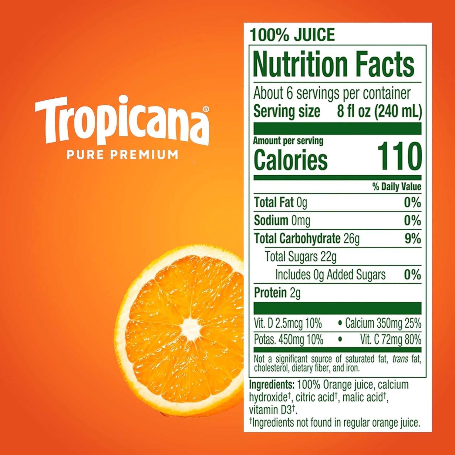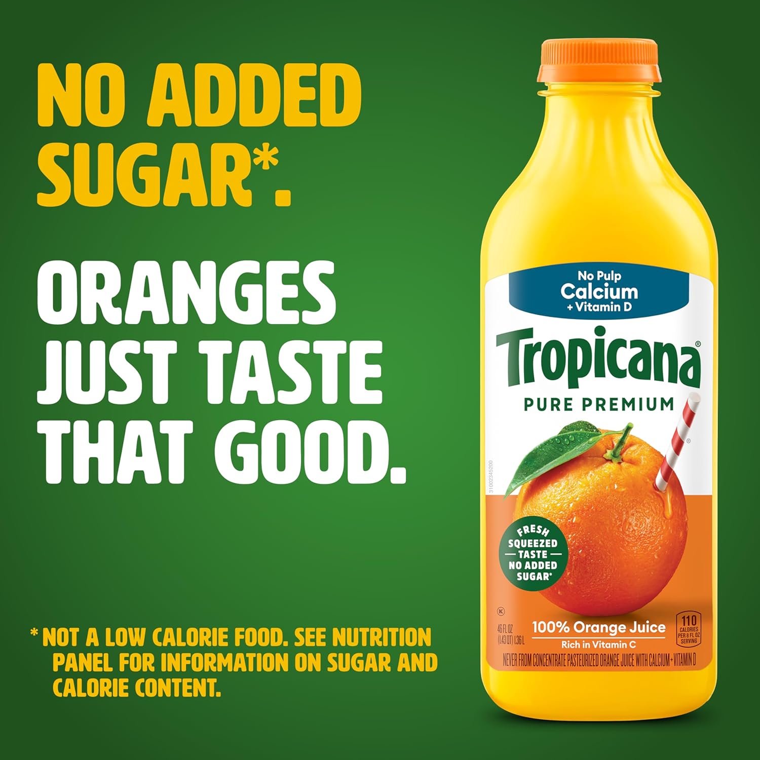 - Tropicana pulp-free OJ with Calcium and Vitamin D contains one cup of fruit in each 8 fl oz serving of this 100% fruit juice, with no artificial flavors, colors or preservatives and no added sugar* and is Non-GMO Project Verified
