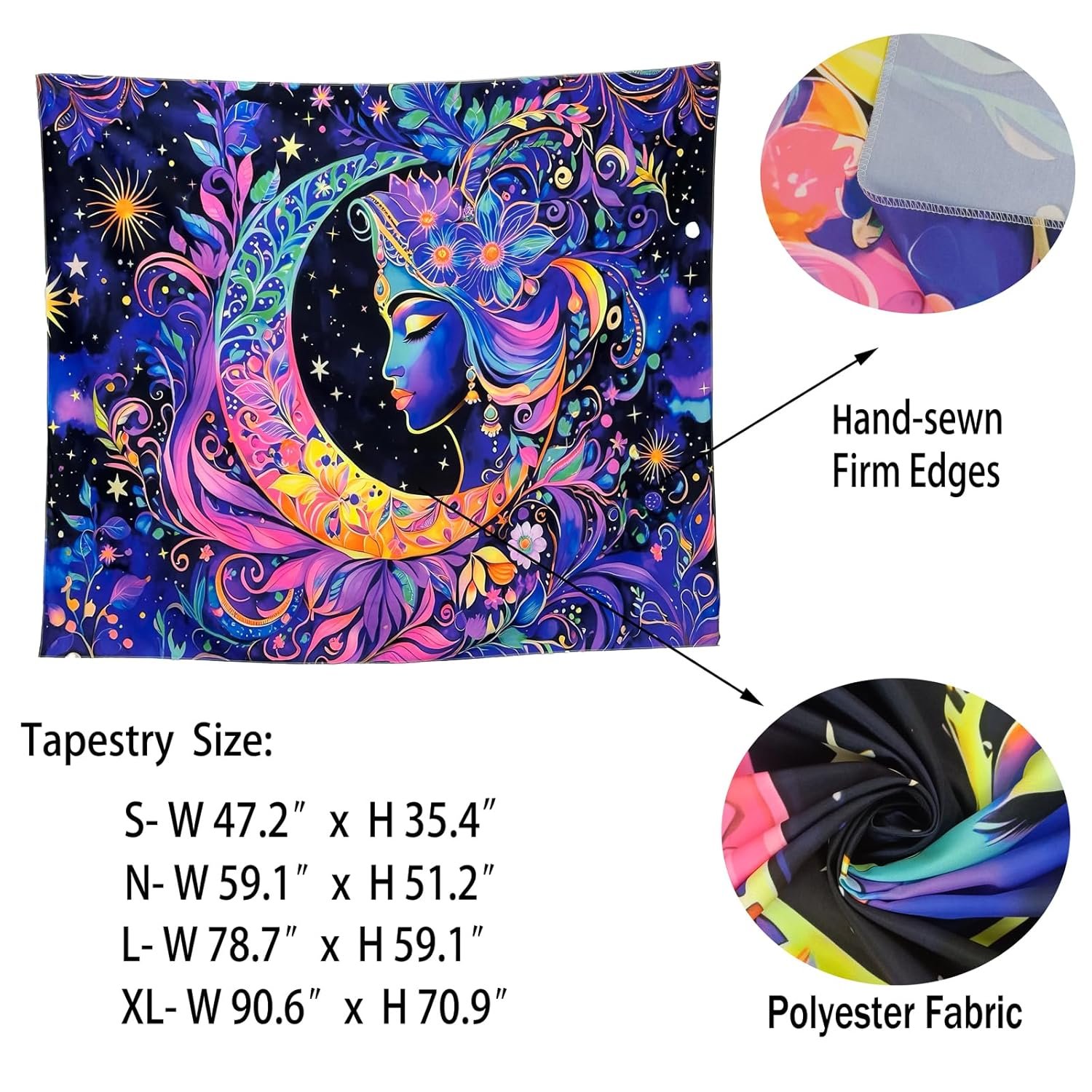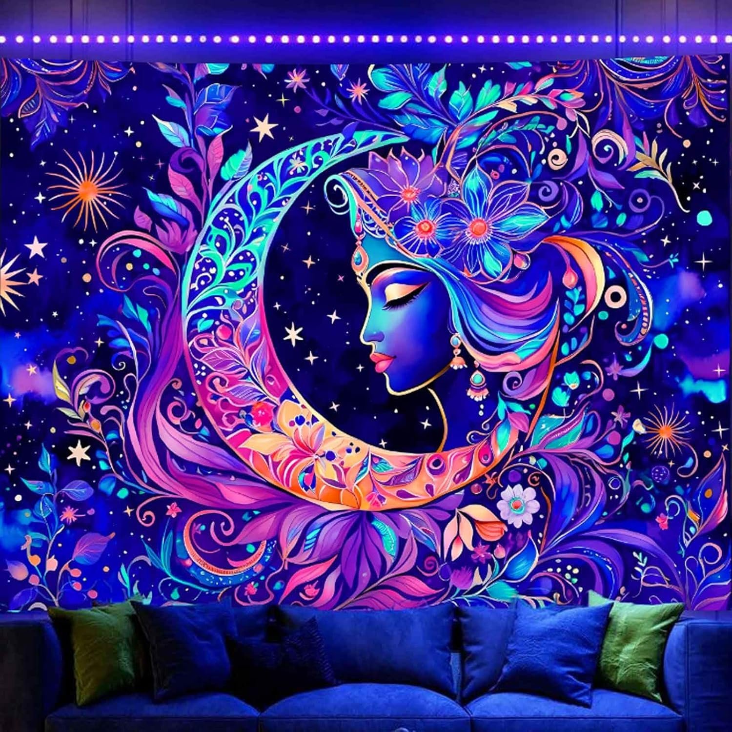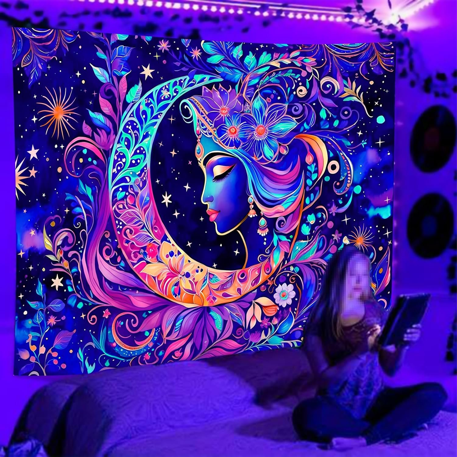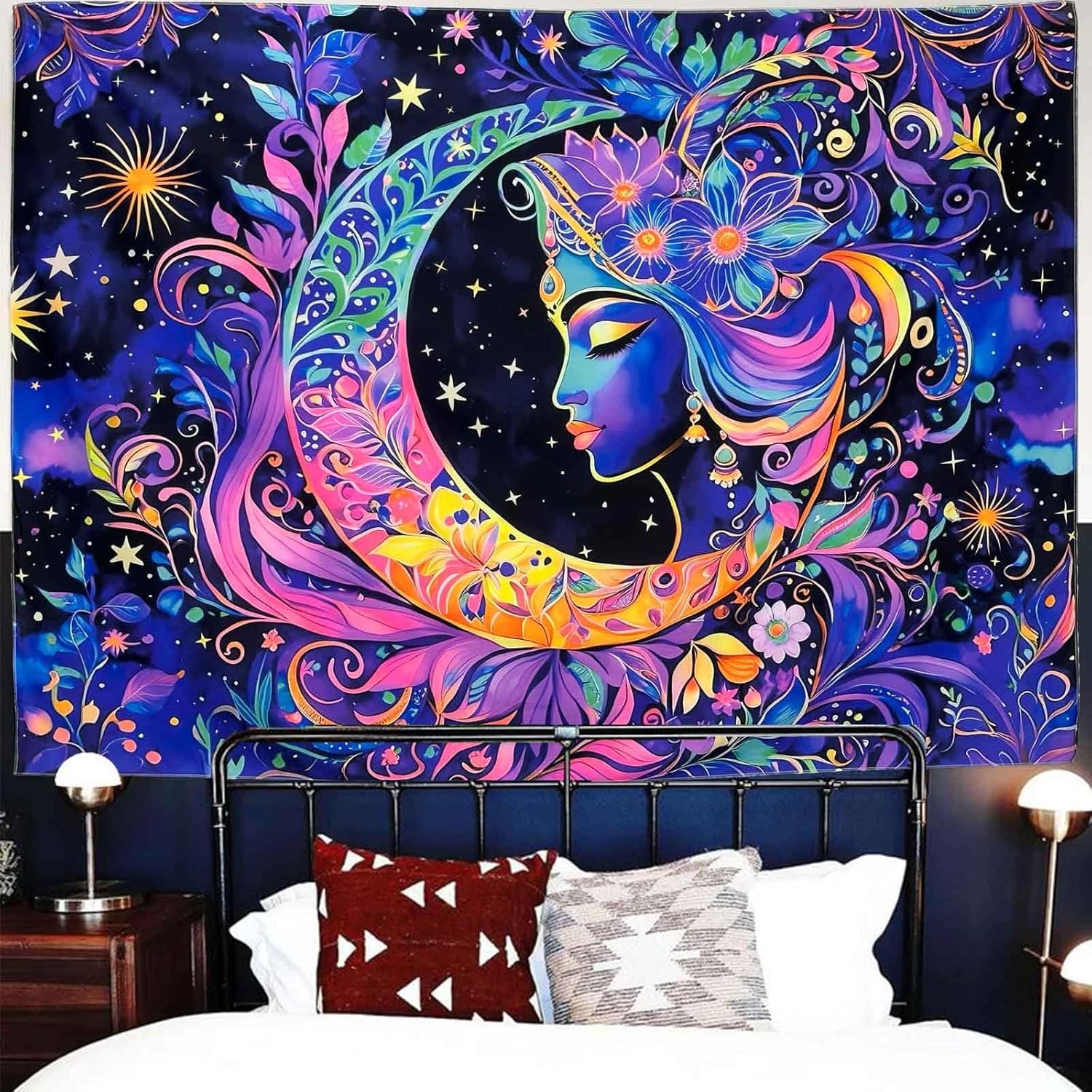 21 reviews for TUGCAY Blacklight Moon and Star Tapestry, UV Reactive Mandala Sun Tapestry Starry Night Tapestries Wall Hanging for Bedroom Dorm Decor(51.2 x 59.1 Inches)