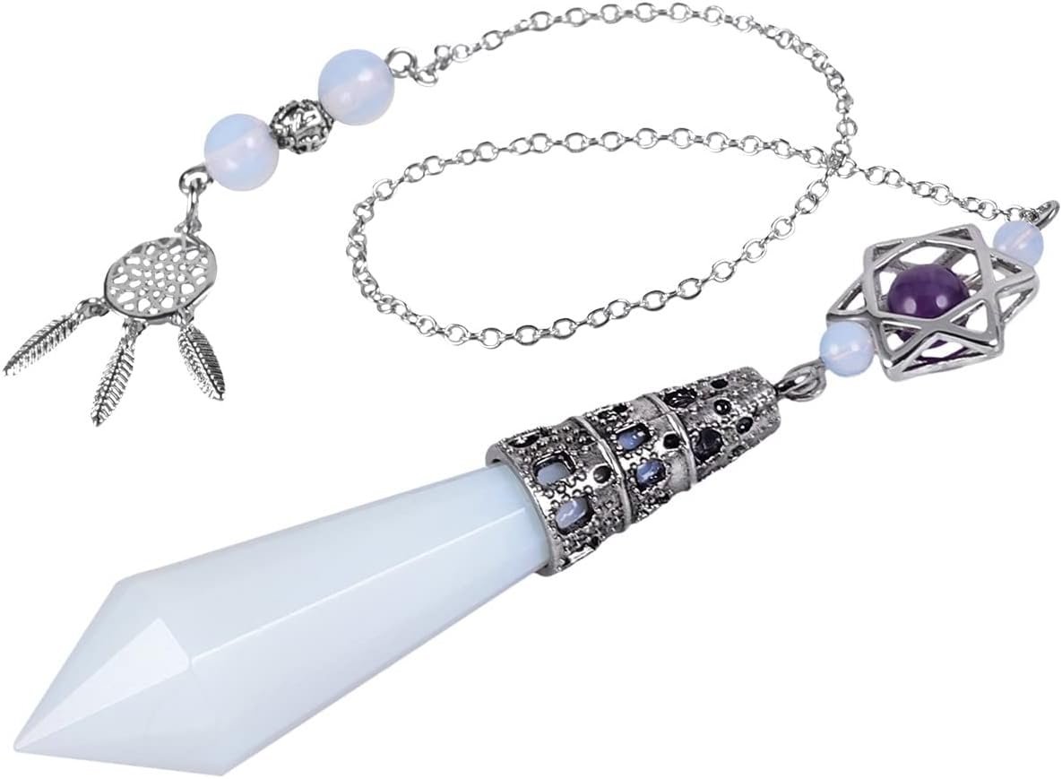 TUMBEELLUWA Reiki 12 Faceted Crystal Pendulum for Dowsing Divination Chakra Stone Pendant with Dream Catcher & Merkaba Star Chain, Opalite