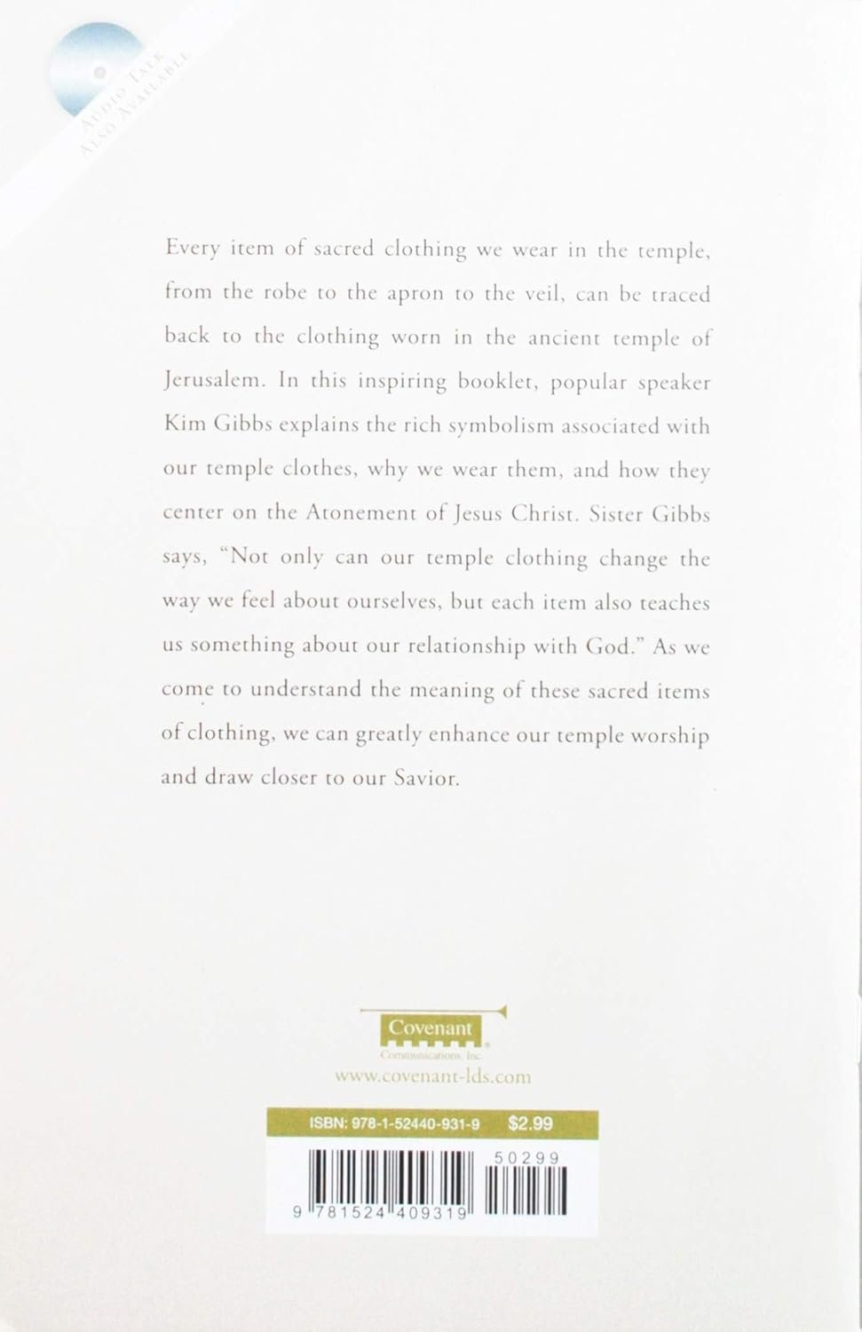 Every item of sacred clothing we wear in the temple, from the robe to the apron to the veil, can be traced back to the clothing worn in the ancient temple of Jerusalem. In this inspiring booklet, popular speaker Kim Gibbs explains the rich symbolism associated with our temple clothes, why we wear them, and how they center on the Atonement of Jesus Christ.Sister Gibbs says, “Not only can our temple clothing change the way we feel about ourselves, but each item also teaches us something about our relationship with God.” As we come to understand the meaning of these sacred items of clothing, we can greatly enhance our temple worship and draw closer to our Savior.