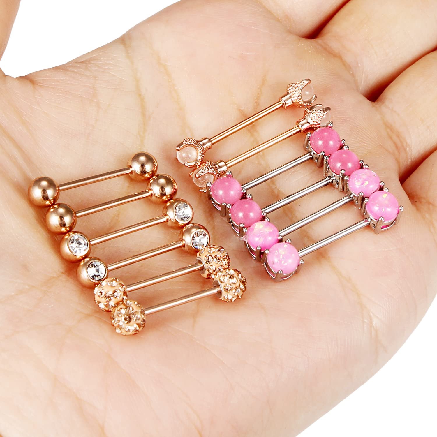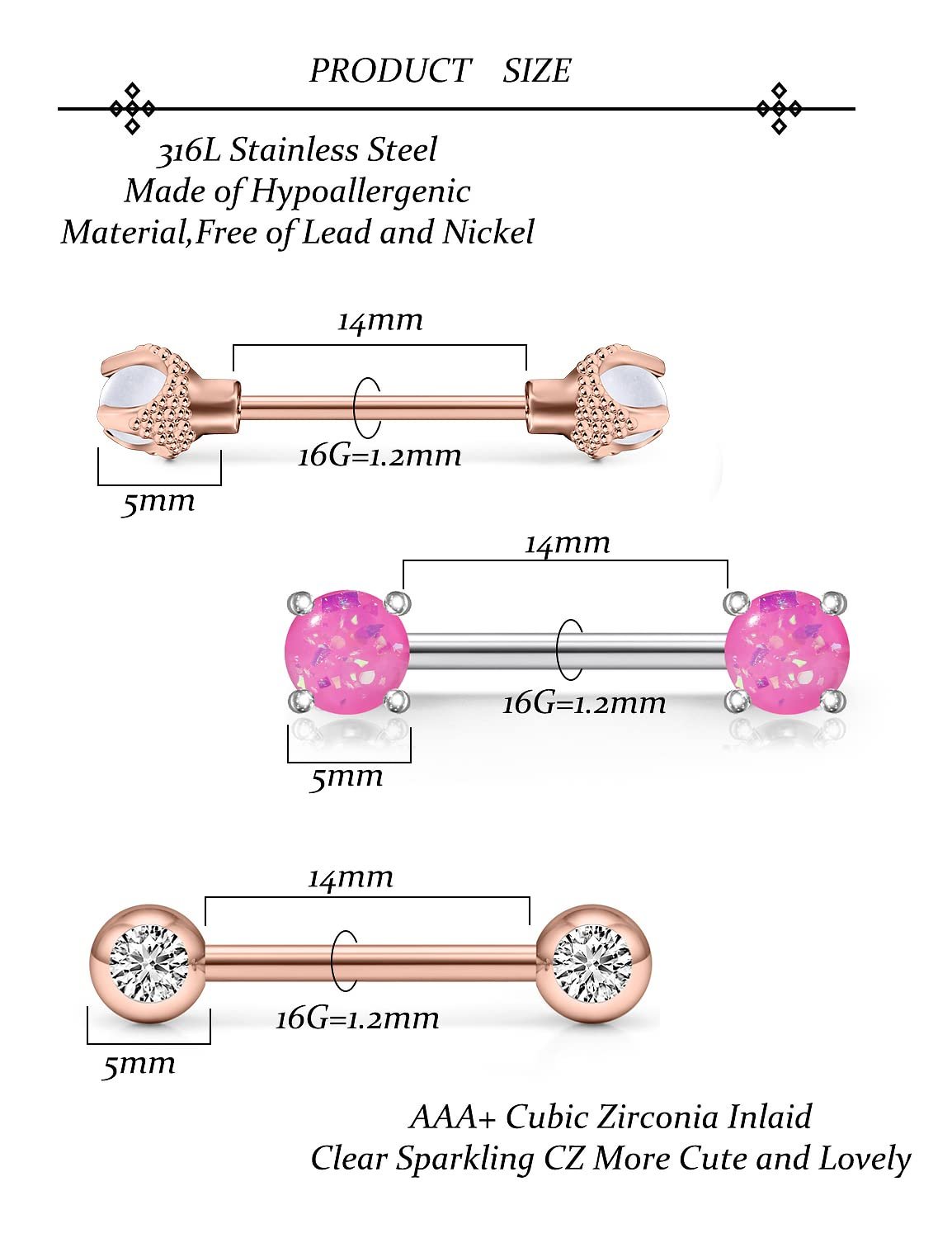 - [PRODUCT SIZE]: Nipple Piercing Jewelry Gauge: 16g=1.2mm, Straight Bar Length: 14mm(9/16Inch); Color: Rose Gold