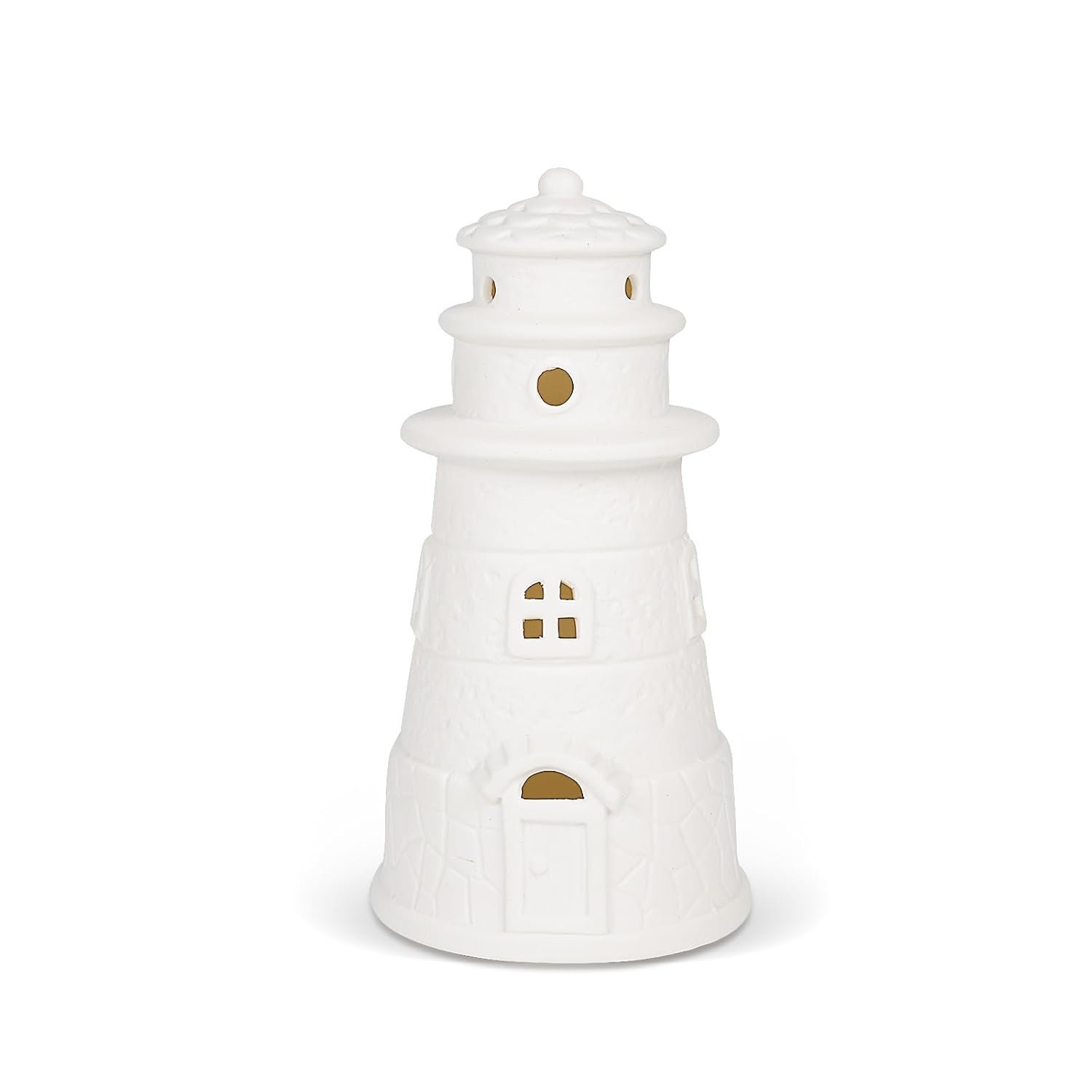 This nautical themed nightlight is small in size yet offers a lovely welcoming glow on our mantle. Designed to allow light to shine through its windows in a size that fits well on a shelf, nightstand, mantle or anywhere with a smaller space to provide illumination to the room. The ceramic in a flat creamy neutral white blends into any room and is beautifully crafted into a classic lighthouse shape and detail. A great value for a statement piece.
